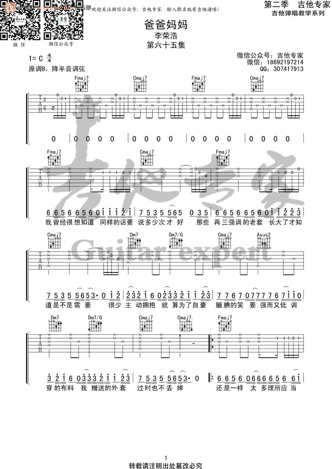 曲谱介绍: 《爸爸妈妈》吉他谱,由吉他专家分享,原调是B调,降半音调弦,这个版本选用C调编配,完整的前奏部分,和弦难度不算大,常规的分解和弦配合扫弦为主要的弹唱节奏,重要的是如何能够抓住这首歌的核心精髓会成为关键,最近这首歌又火了,喜欢的朋友,加油练习吧。