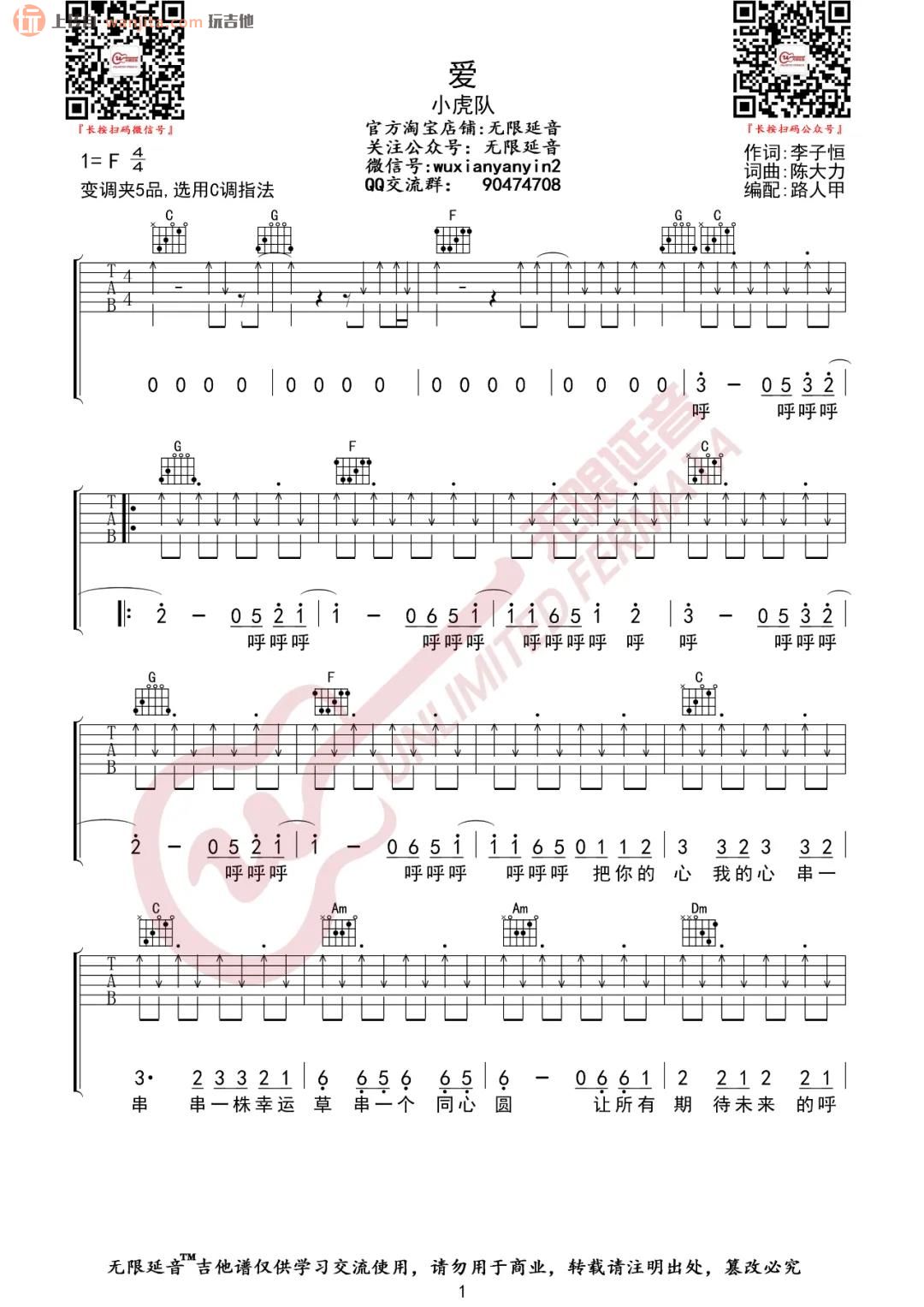 曲谱介绍: 《爱》吉他谱,这首歌由无限延音编配分享,原调是F调,本身是一首节奏感十足并快速的歌曲,但这个版本是选用的C调指法,变调夹夹在5品,这首歌所以从节奏上用了扫弦配合切音来弹奏,这样的方式,应该也能够从单吉他伴奏下,将这首歌曲尽量演绎到完美。喜欢的朋友可以试试整体弹唱效果。