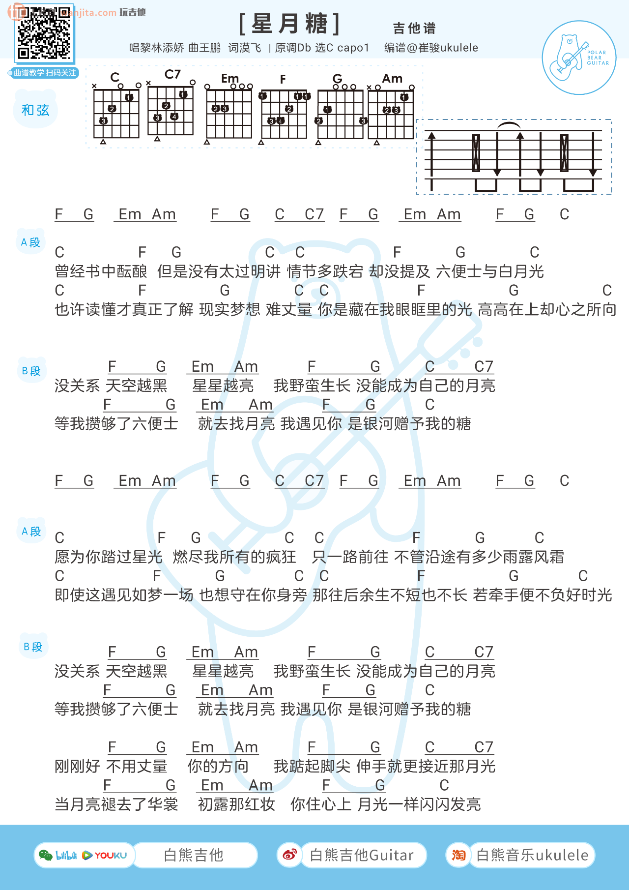 曲谱介绍: 星月糖吉他谱,这个版本是采用和弦谱的方式,歌曲比较简单,给大家准备了一组节奏,当然大家也可以根据自己的方式弹奏,原调是bD,选用的C调编配,变调夹可以夹一品弹唱,喜欢的朋友可以先试试哦,有什么问题可以及时在评论下方告诉我。