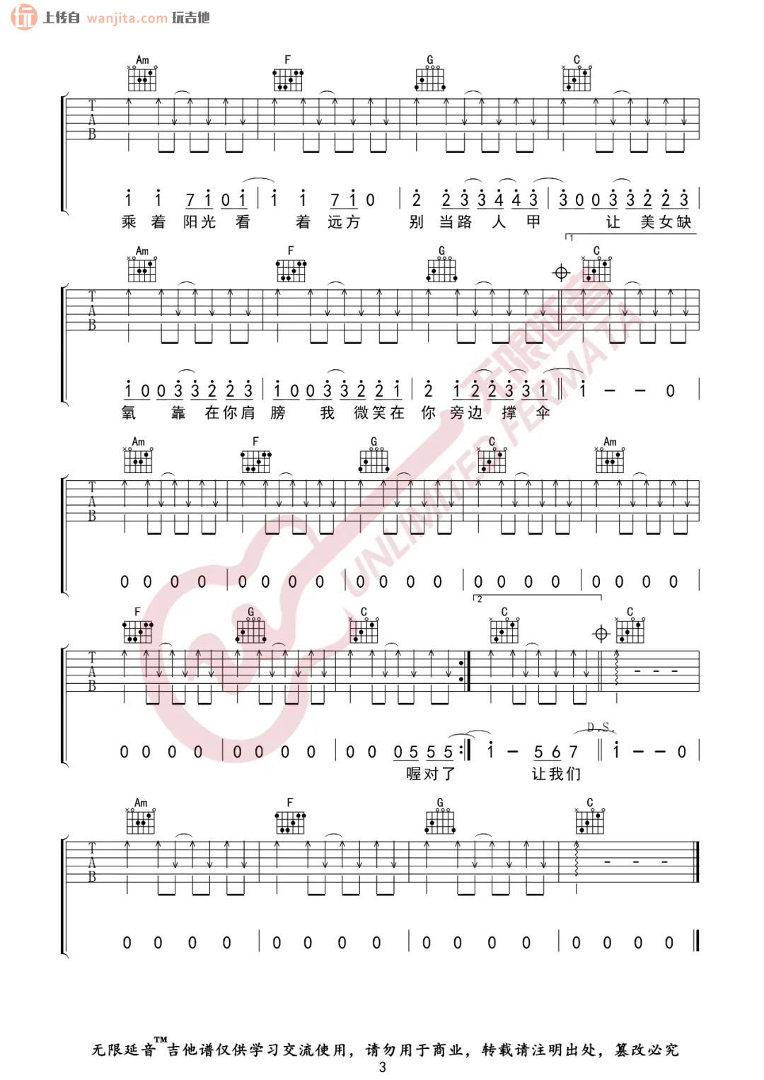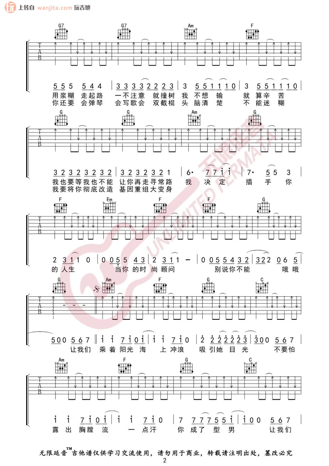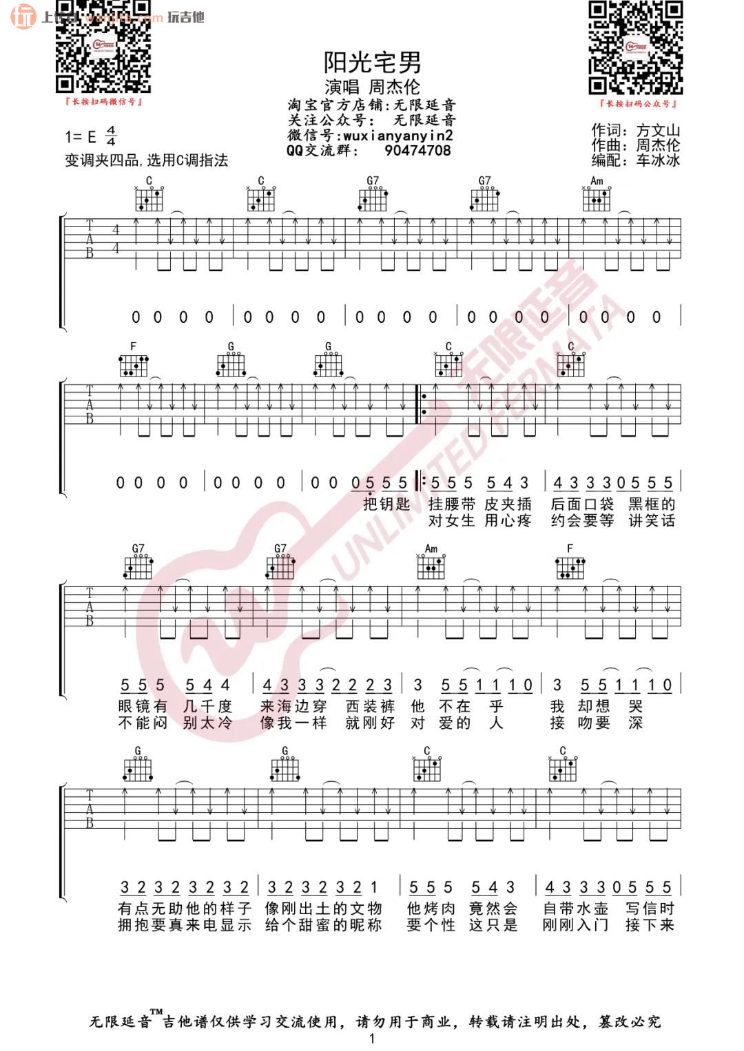 曲谱介绍: 《阳光宅男》吉他谱由无限延音编配,原调是E调,选用的C调指法,变调夹夹4品,全程指法比较简单,扫弦作为主要的节奏,一定要练好节拍与节奏,也是这首歌歌曲的关键,然后应该可以很好的练习这首歌曲了。