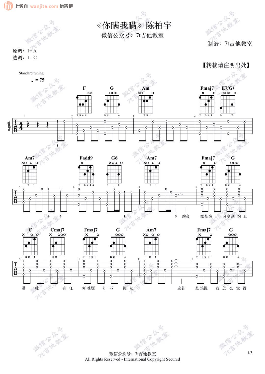 曲谱介绍: 《你瞒我瞒》吉他谱,由7T吉他教室提供分享,原调是A调,选用了C调编配,变调夹夹一品处,整首歌曲包含了完整的前奏,歌曲演唱可以从视频中看出,演示的KEY完全是低于原唱版本的部分,大家可以根据自己的音域拿捏,如果实在唱不上去,可以根据视频的版本来,如果按原调唱,可以夹在3-5品处,效果可能会比较好。 《你瞒我瞒》吉他弹唱视频教学演示