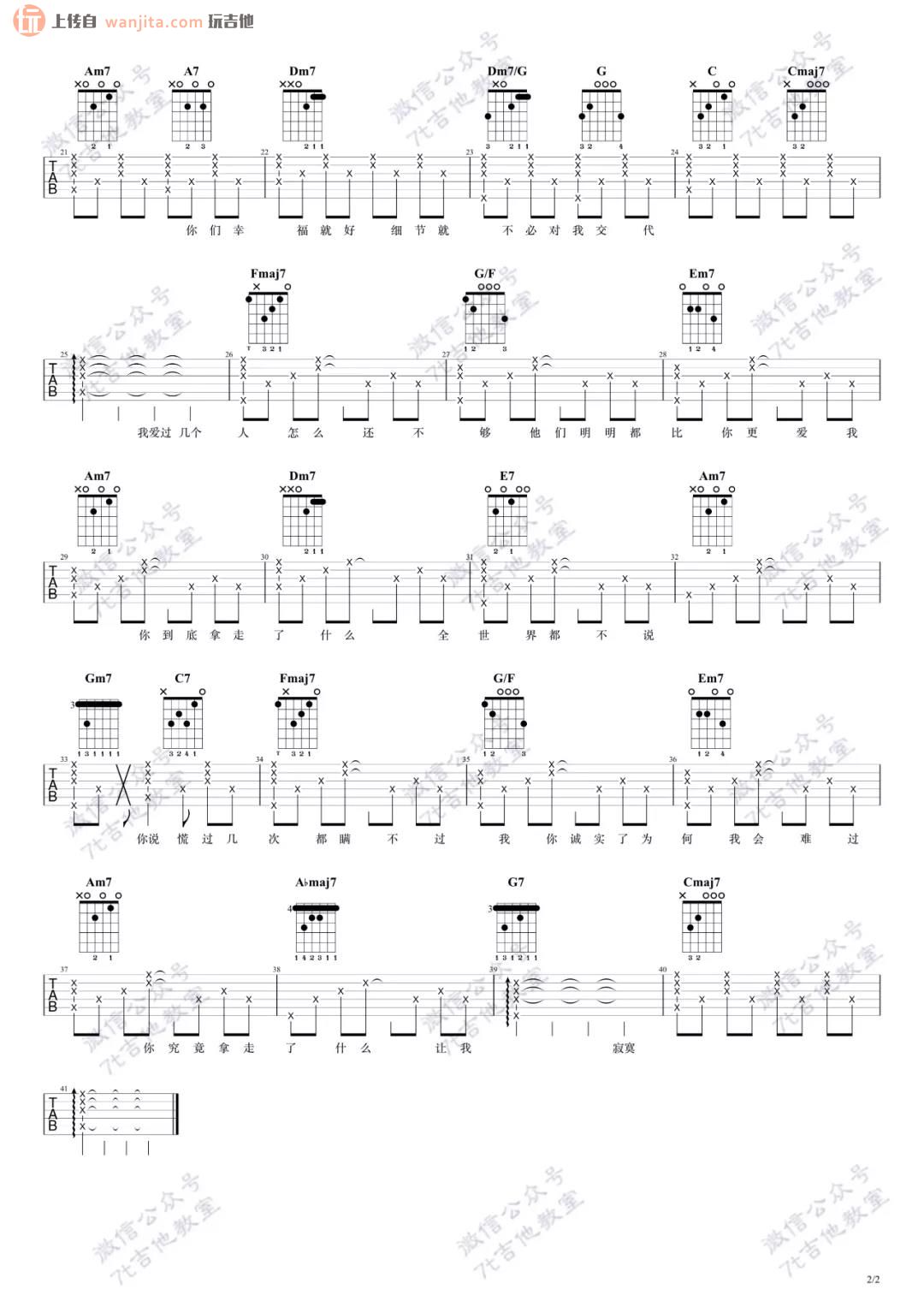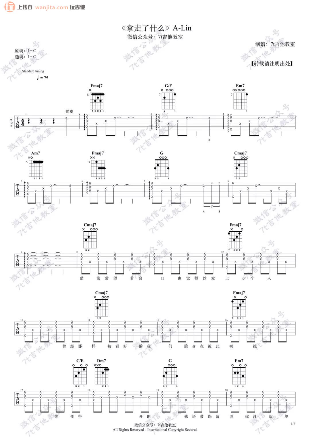曲谱介绍: 《拿走了什么》吉他谱,由7T吉他教室提供吉他谱分享和视频演示,感兴趣的可以先看看吉他弹唱的视频演示,这个版本C调执法是用男声版弹唱,变调夹夹在2品处,如果女声弹唱可以夹至5品处试试,整首歌曲完全按照原版来扒谱,包含了完整的前奏,主歌部分以半分解和弦弹唱,另外有个小地方需要提醒一大家第8小节的第1个音应该是1弦和5弦,谱子上是1弦和6弦,大家可以注意一下!~ 《拿走了什么》吉他弹唱视频演示
