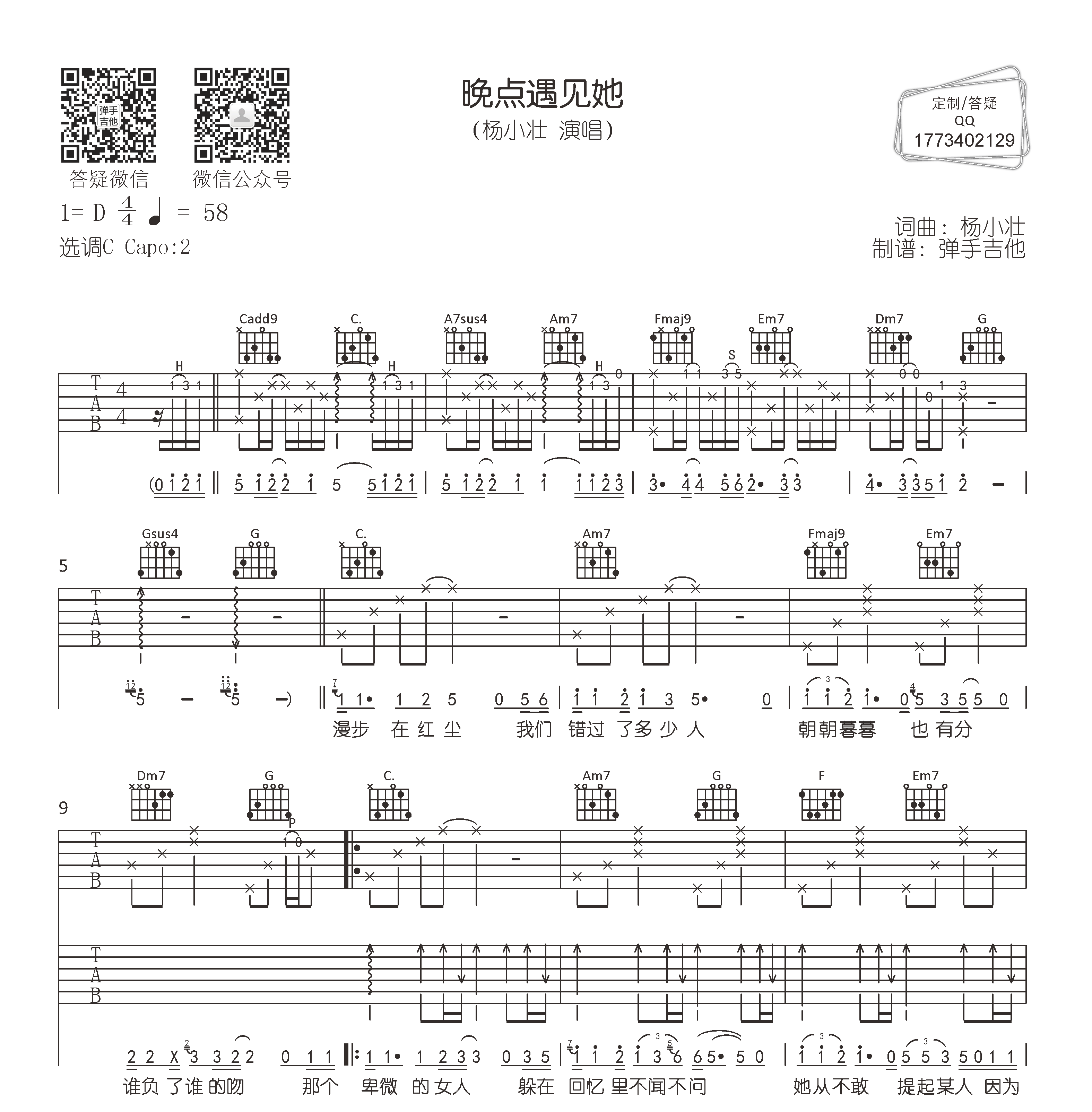 曲谱介绍: 杨小壮《晚点遇见她》吉他谱,由@弹手吉他制谱,《晚点遇见他》吉他弹唱谱,共有两张图片谱例,选用C调指法,原调D调,速度58BPM,节奏4/4拍,建议变调夹夹在2品处弹唱,难度初级简单。