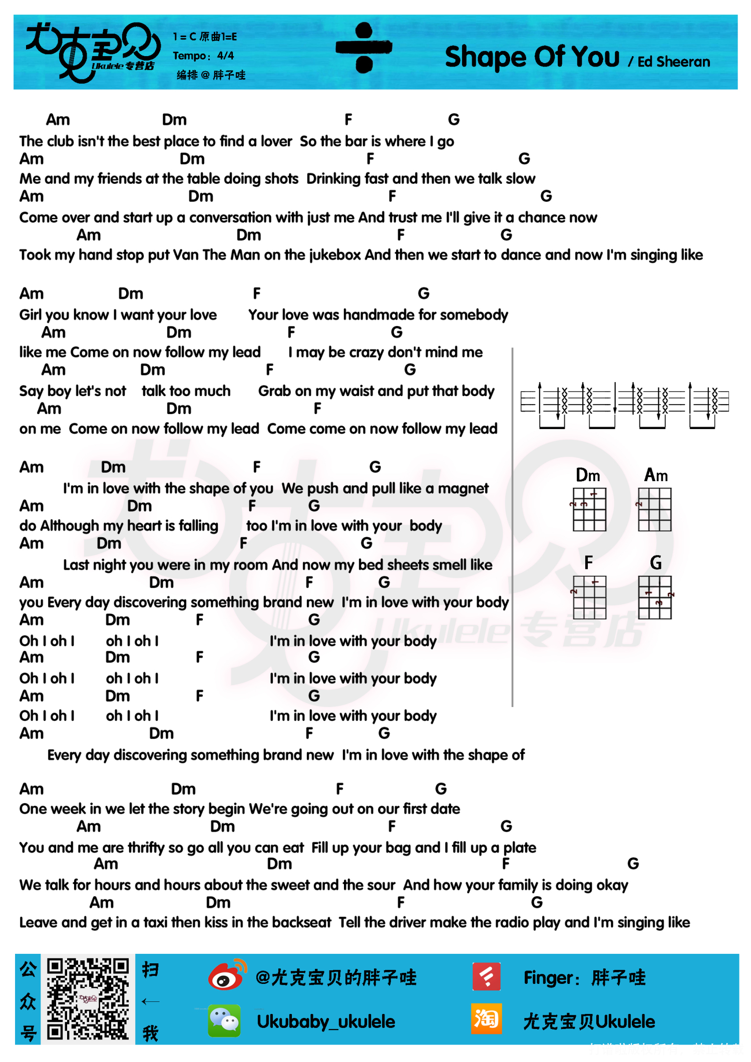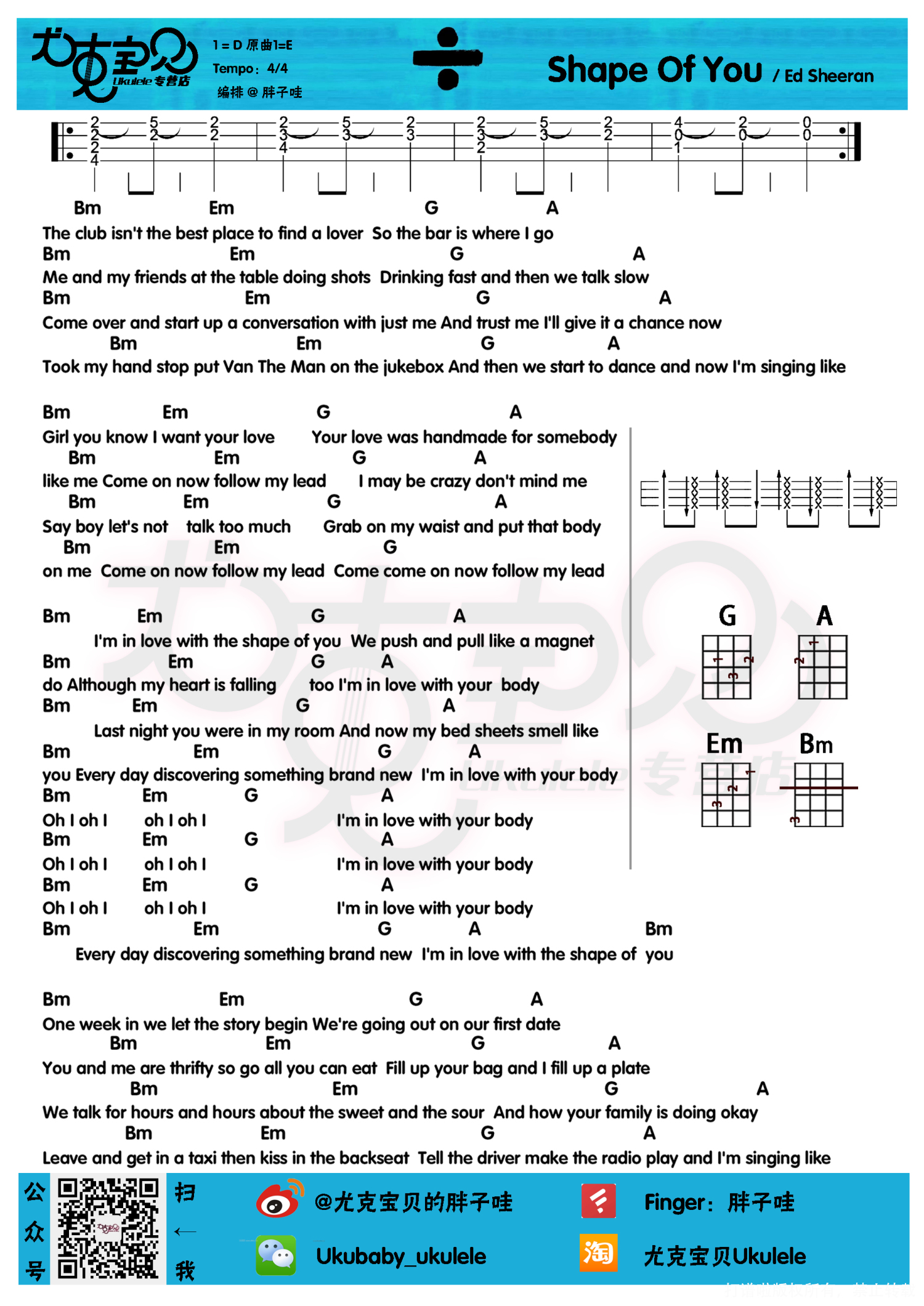 曲谱介绍: 〈Shape Of You〉的演唱者是英国创作歌手Ed Sheeran,1991年出生的不折不扣的90后。 简单Loop的背景旋律,成功将现代流行音乐重组。 歌曲施展温柔抒情路线,递送出Ed Sheeran最擅长的婉约风格,突显出其创作力的强劲。 黄老板标志性哼唱融入电子 → 好听洗脑停不下来! 〈Shape Of You〉到底有多火?称霸全球多国排行榜冠军,打破英美排行双纪录,128国iTunes榜冠军,第60届格莱美最佳流行表演提名,18年全英音乐奖最佳单曲提名……(多到数不过来!) 当今欧美乐坛设定潮标的人物的Ed Sheeran。这首歌继续彰显他“故事高手+旋律大拿+声音达人”三合一的叱咤功力。 把情幻欲想唱得如此云淡风轻,是艺术家之于爱的矜持,是男人之于性的离骚。简简单单,细水长流,妹子不只偏好轰轰烈烈,洪荒而逝。     Ukulele Loop弹唱演示 TIPS ► 子哇尝试了用Loop来翻弹,特别邀请了也特别喜欢黄老板的熙叔来唱,超级开心的合作! ► 翻彈前把能找到的各种Ed和各种翻弹的版本都研究了一遍。越听越喜欢,甘愿被洗脑!   弹唱曲谱