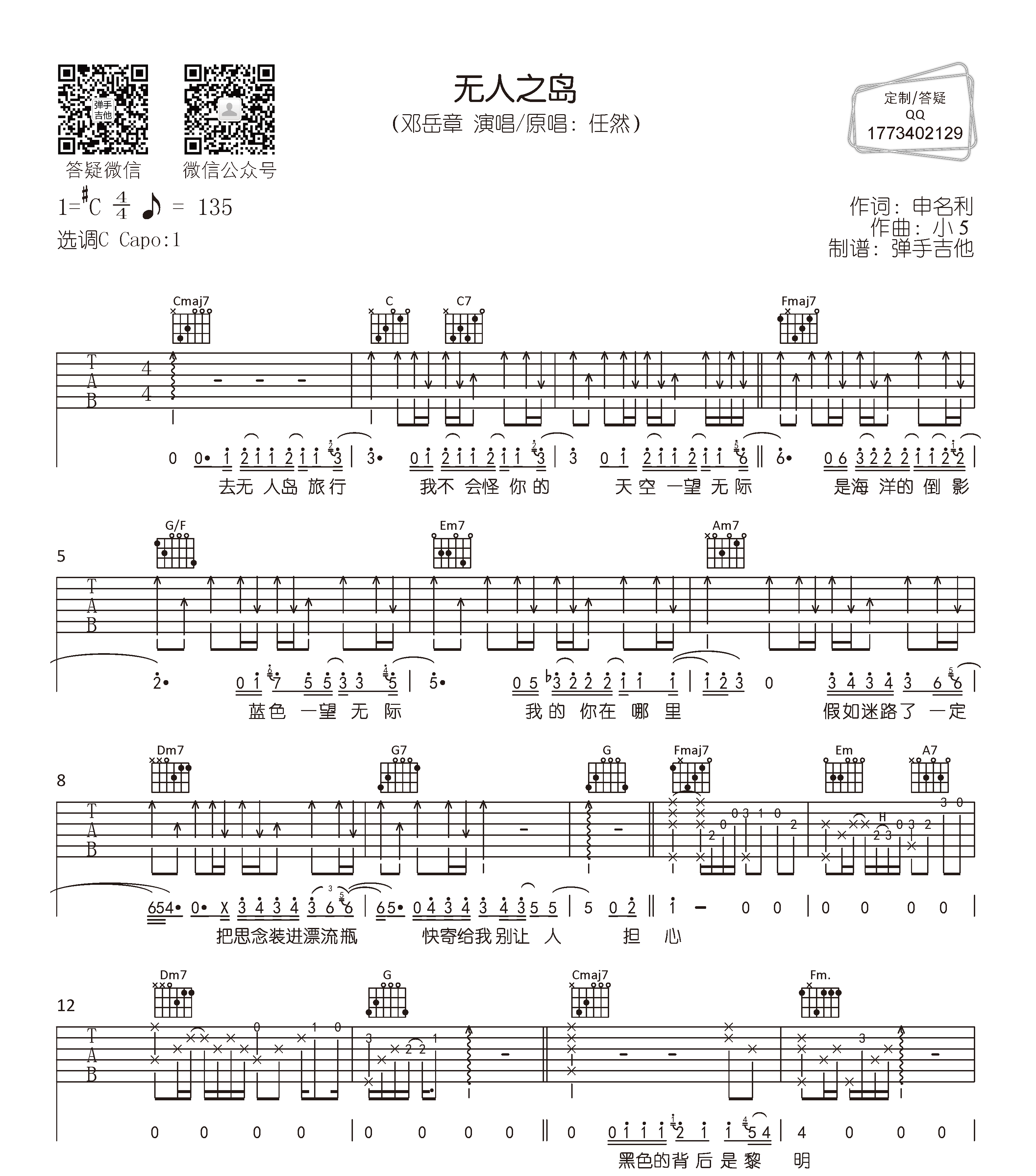 曲谱介绍: 无人之岛吉他谱,邓岳章翻唱任然的一首抒情歌曲,《无人之岛》吉他弹唱谱,共有4张图片谱,选用C调指法,原调#C,建议变调夹夹1品弹唱,难度较简单按原版编配,本谱由@弹手吉他制谱上传。