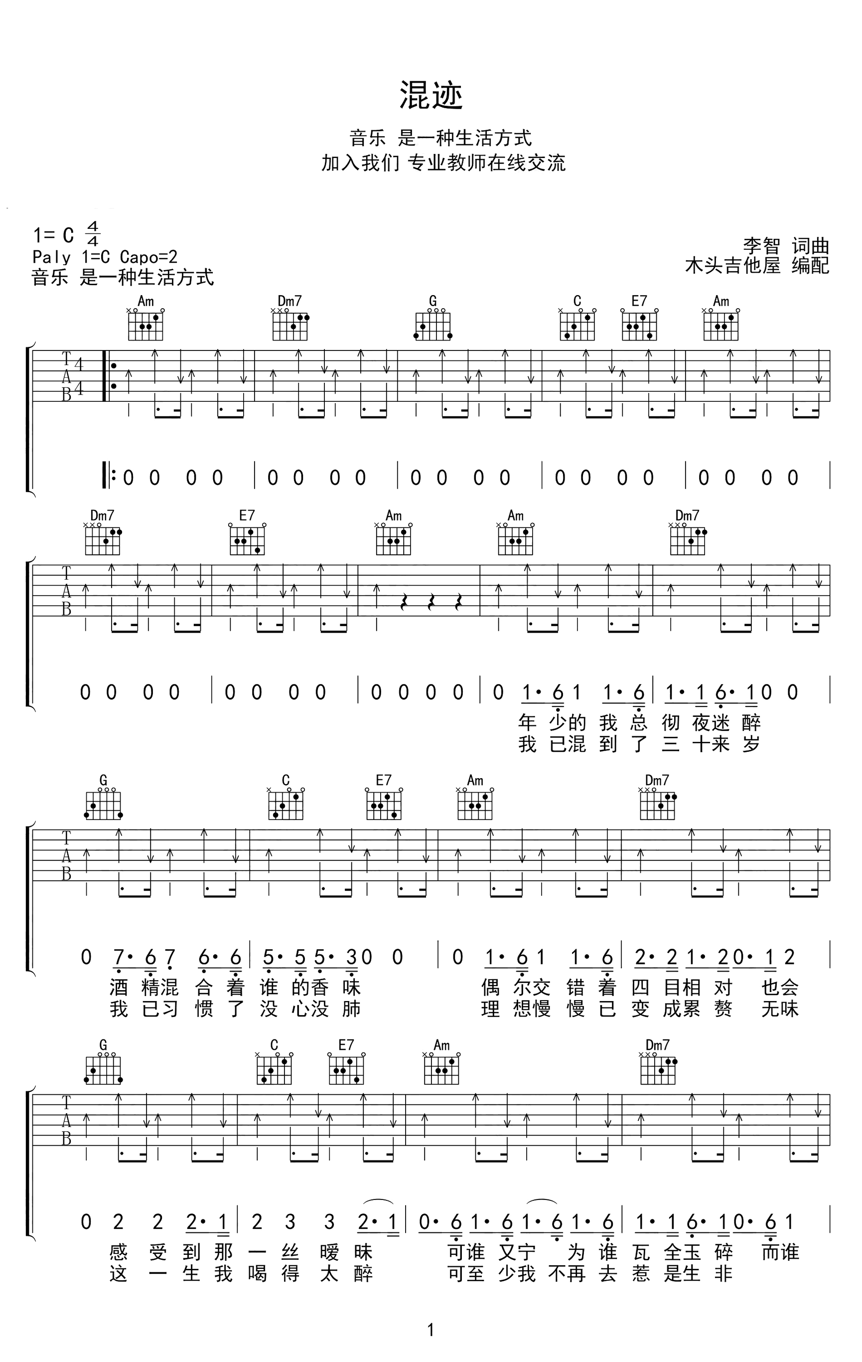 曲谱介绍: 混迹吉他谱,独立音乐人李智的创作歌曲,将悲伤吞咽入喉,藏进词中,出口却是明快洒脱的旋律。《混迹》吉他弹唱谱,选用C调指法编配,三张高清图片六线谱。