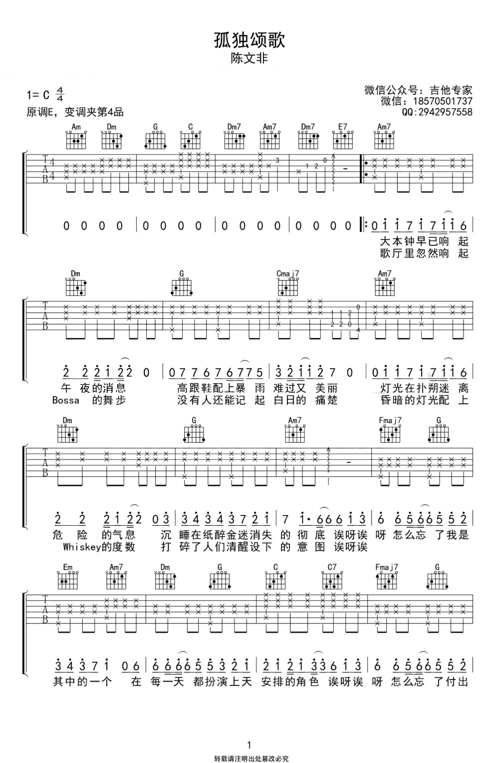 孤独颂歌吉他谱 - 陈文非 - C调吉他弹唱谱