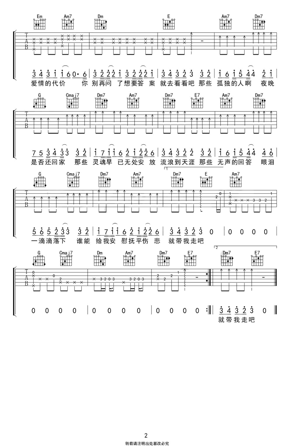 曲谱介绍: 哪里有人喜欢孤独,不过是不喜欢失望。《孤独颂歌》吉他谱,原调E,变调夹夹第四品,选用C调指法,两张图片六线谱。