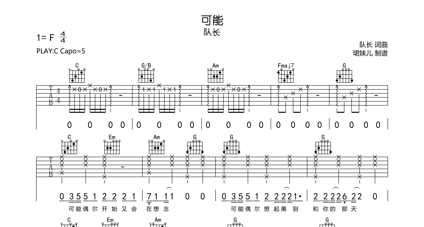 曲谱介绍: 队长《可能》吉他谱,由@珺妹儿制谱,《可能》吉他弹唱谱,共有两张图片谱,本谱采用C调指法编配,弹唱建议变调夹5品,速度85BPM,节奏4/4拍,难度较简单,易上手。