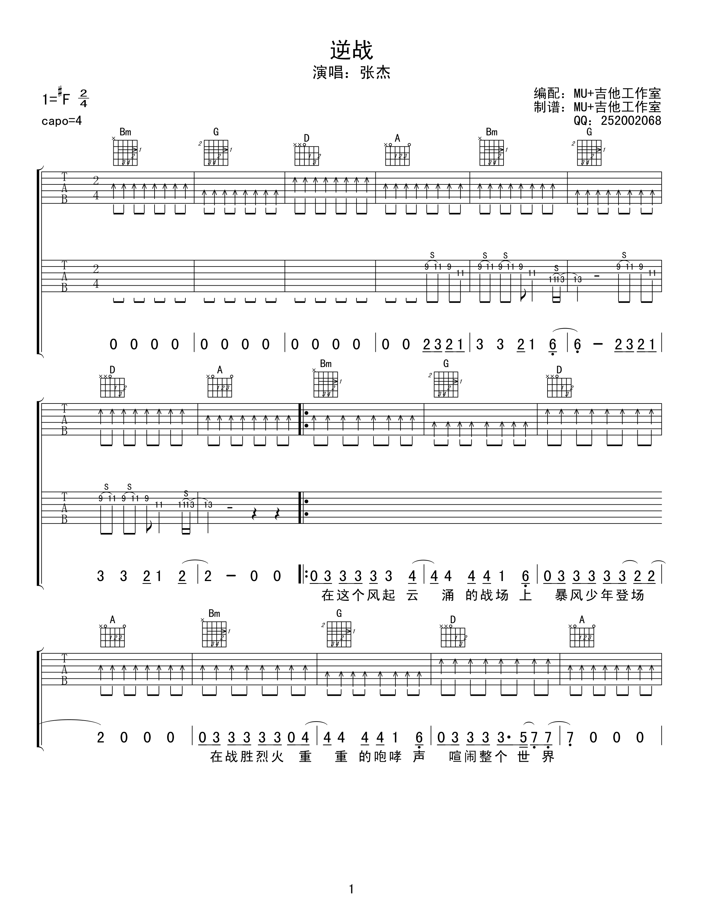 曲谱介绍: 《逆战》吉他谱,由玩吉他整理上传,张铁东编配制谱,原调是#F调,变调夹可以夹在4品处进行弹唱,主要以扫弦节奏为弹唱节奏型,整体弹唱难度不算太大,在和弦的处理上会有一些高把位的变化,尽可能在弹唱之前进行转换熟悉,便于更加顺畅的弹唱。
