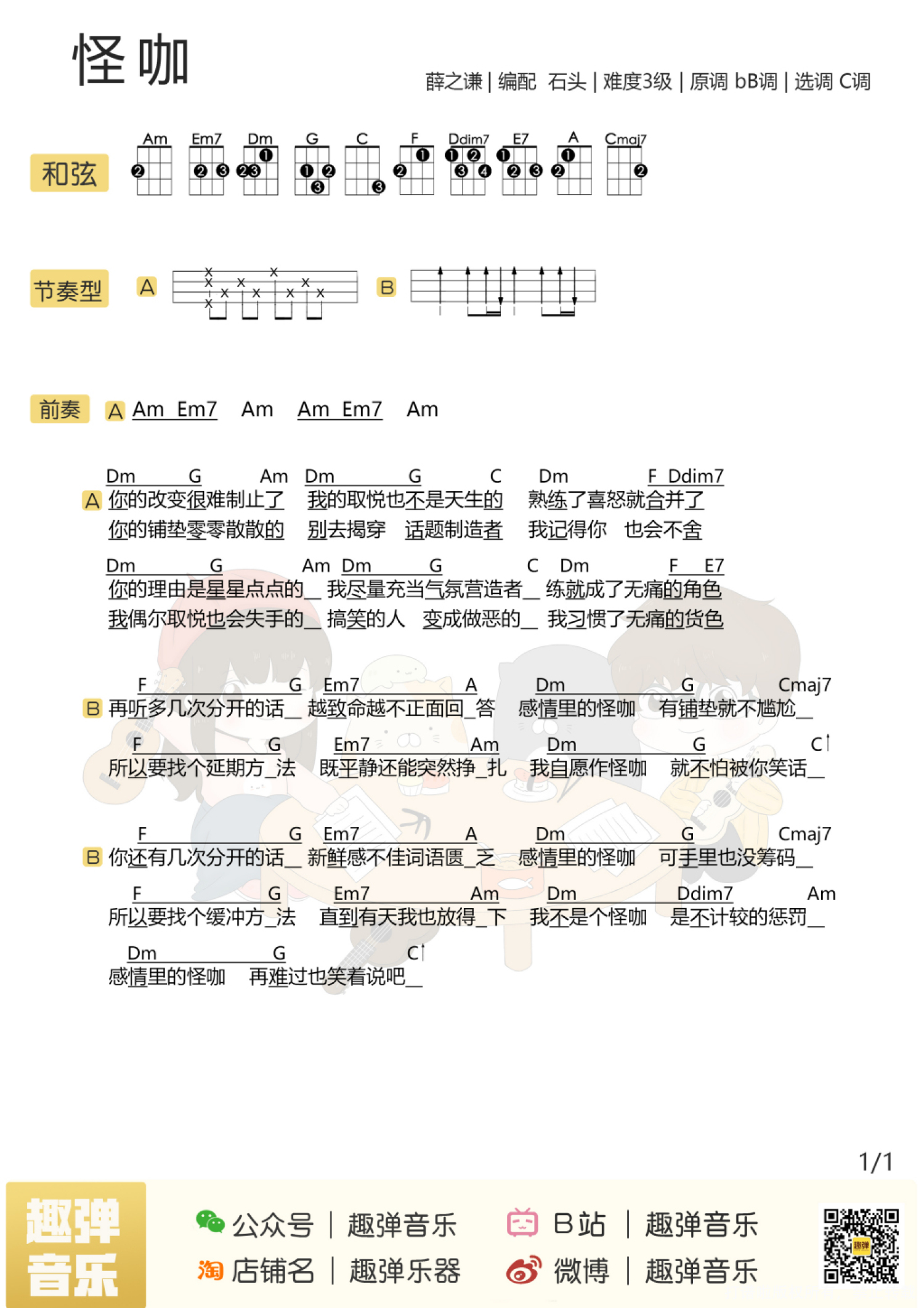 曲谱介绍: 《怪咖》尤克里里谱 Aloha 薛之谦又出新歌啦~ 歌名叫「怪咖」 今天为大家奉上香喷喷的曲谱~ 音乐缓缓舒展 极具辨识度的低音 扑面而来的是独特的落寞寂寥感 能听懂老薛的歌 都是有故事的人吧 这首歌曲是薛之谦和杨迪在《无限歌谣季》这档综艺节目中共同演绎的,当期的主题是情书,但两位出场就是小丑打扮,再加上开头活泼轻快的音乐,怎么也与“情书”搭不上边。 然而画风一转,本应该只有快乐情绪的小丑唱起了深情的歌,这样的反差,更令人扎心。 谈起创作灵感时,薛之谦说,杨迪在他的心中,就好像不管发生什么事情,他没有难过过。杨迪说,其实他难过过。 杨迪继续说,面对感情时,很多人分手的时候会哭,也有很多人不哭,看起来洒脱,但有可能他的心里最痛。