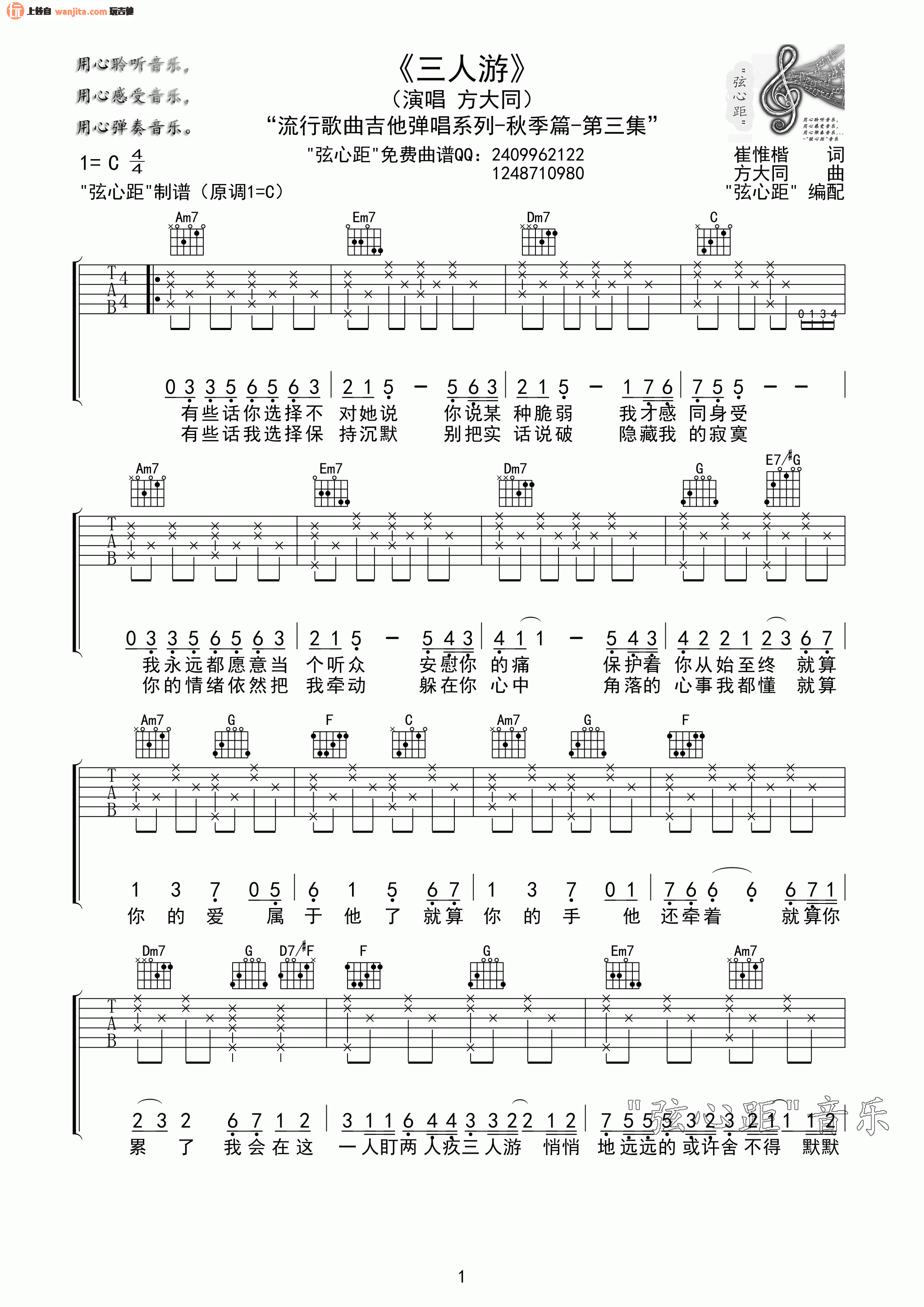 曲谱介绍: 三人游这首吉他谱,原调是C调,编配也是选用的C调指法,整个版本比较简单,选用半分解和弦的节奏弹唱,副歌部分的扫弦也比较规律,很容易就能够掌握上手,喜欢的朋友赶紧试试吧。