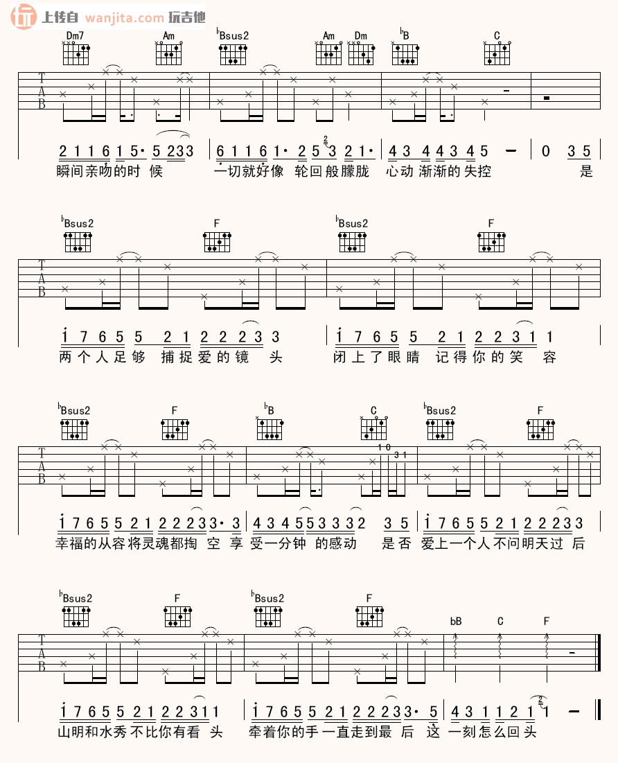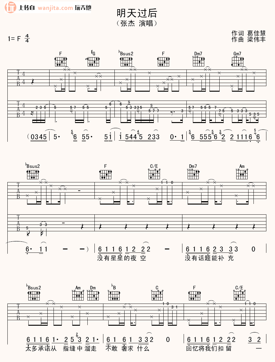 曲谱介绍: 张杰《明天过后》吉他谱,总共2张高清图片谱,选用F调指法,节拍4/4拍,不使用变调夹,弹唱难度初级。