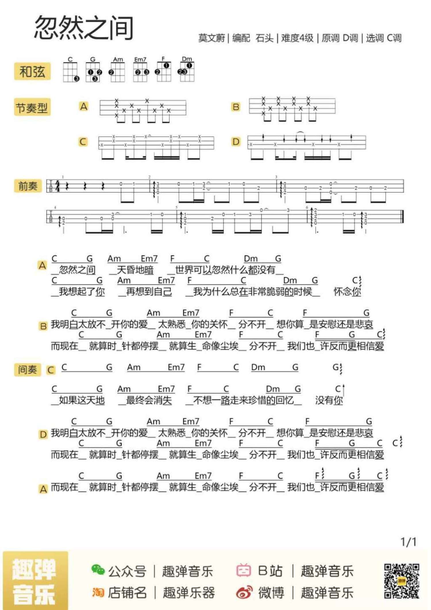 当前位置:琴谱网>尤克里里>忽然之间