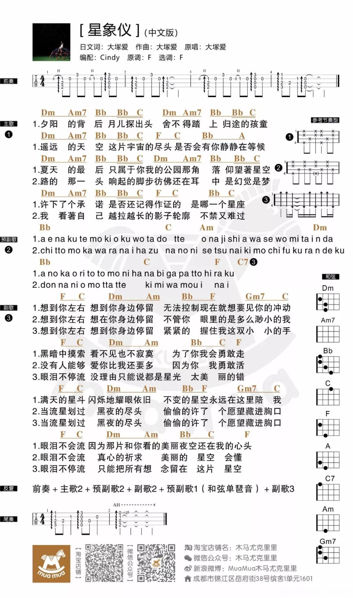 曲谱介绍: 《星象仪》尤克里里弹唱谱 2005年这首歌随着经典日剧 《花样男子》 (没错就是道明寺和杉菜)传入中国 作为第一部的插曲 很多喜欢该剧的小伙伴也被 这首歌独特的旋律所吸引 好多不会日语的盆友 都表示超喜欢这首歌! 所以在2008台北演唱會上 大塚爱弹唱了填上中文词的[星象仪] 送给中国的歌迷 个人觉得中文词写得相当好啊!!
