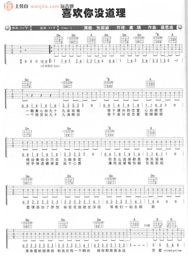 曲谱介绍: 张韶涵《喜欢你没道理》吉他谱,总共1张高清图片谱,原调为#F调,选用F调指法,节拍4/4拍,建议使用变调夹夹一品,弹唱难度初级。