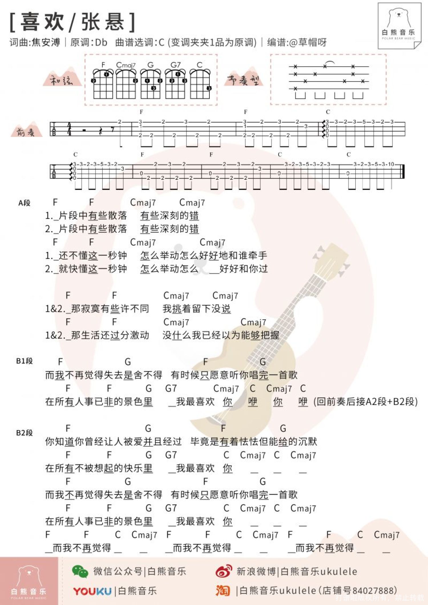 曲谱介绍: 《喜欢》尤克里里弹唱谱