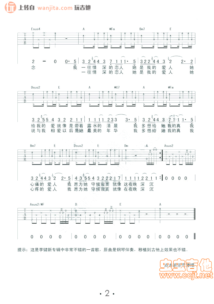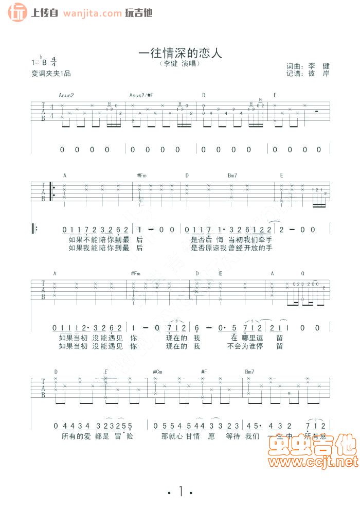曲谱介绍: 李健《一往情深的恋人》吉他谱,总共2张高清图片谱,选用降B调指法,节拍4/4拍,建议使用变调夹夹1品,弹唱难度初级。
