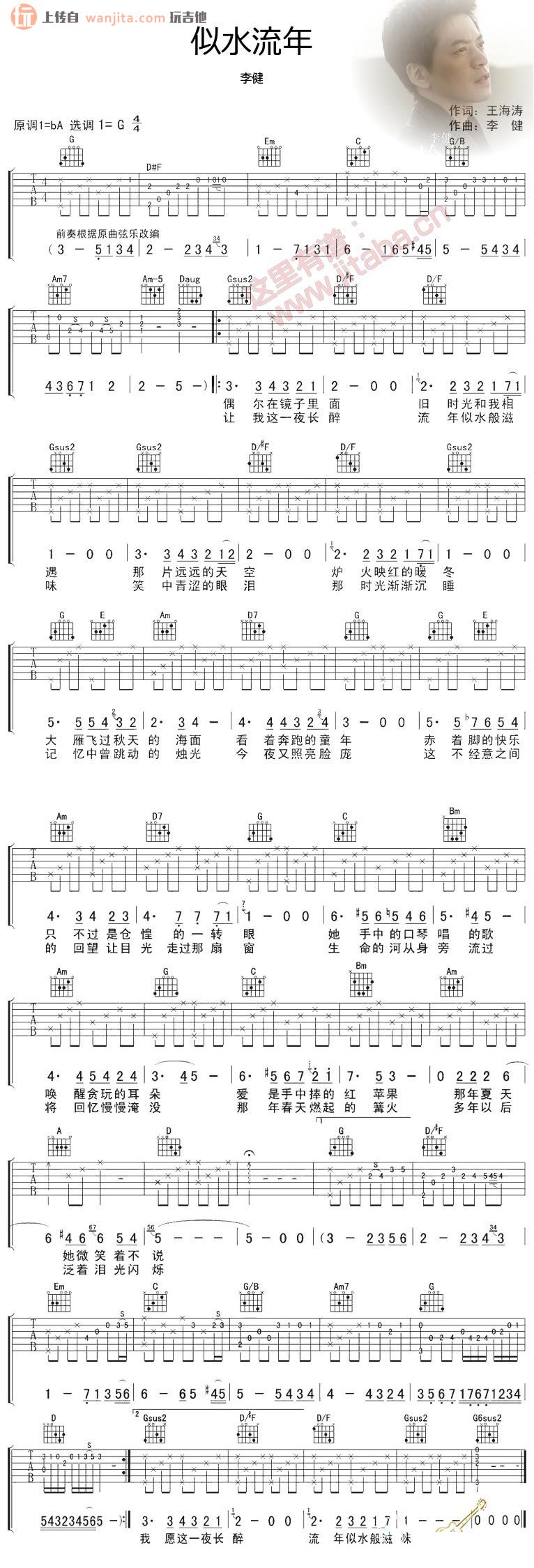 曲谱介绍: 李健《似水流年》吉他谱,总共1张高清图片谱,原调为降A调,选用G调指法,节拍4/4拍,不使用变调夹,弹唱难度初级。
