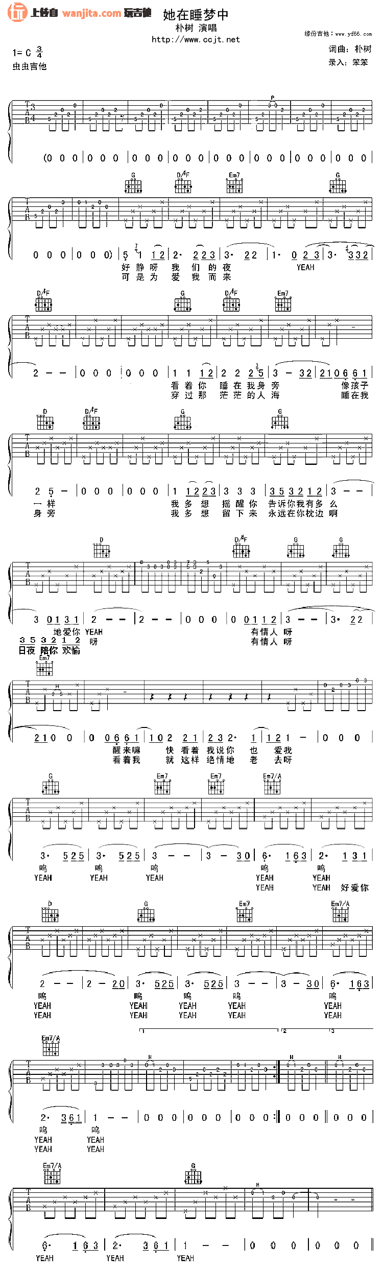 曲谱介绍: 朴树《她在睡梦中》吉他谱,总共1张高清图片谱,选用C调指法,节拍3/4拍,不使用变调夹,弹唱难度初级。