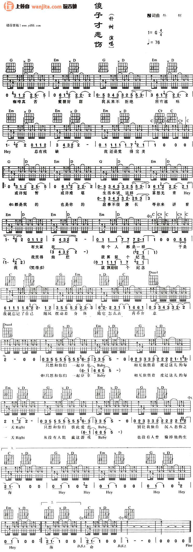 曲谱介绍: 朴树《傻子才悲伤》吉他谱,总共1张高清图片谱,选用G调指法,节拍4/4拍,速度为每分钟76BPM,不使用变调夹,弹唱难度初级。