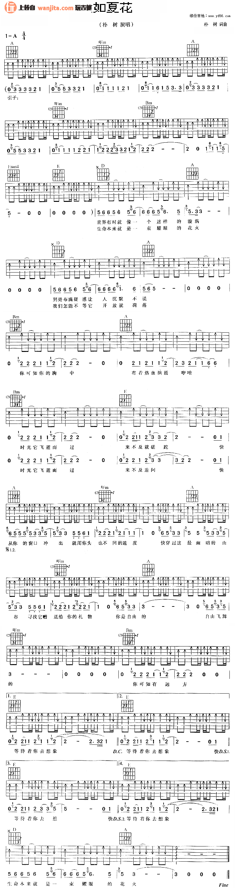 曲谱介绍: 朴树《生如夏花》吉他谱,总共1张高清图片谱,选用A调指法,节拍4/4拍,不使用变调夹,弹唱难度初级。