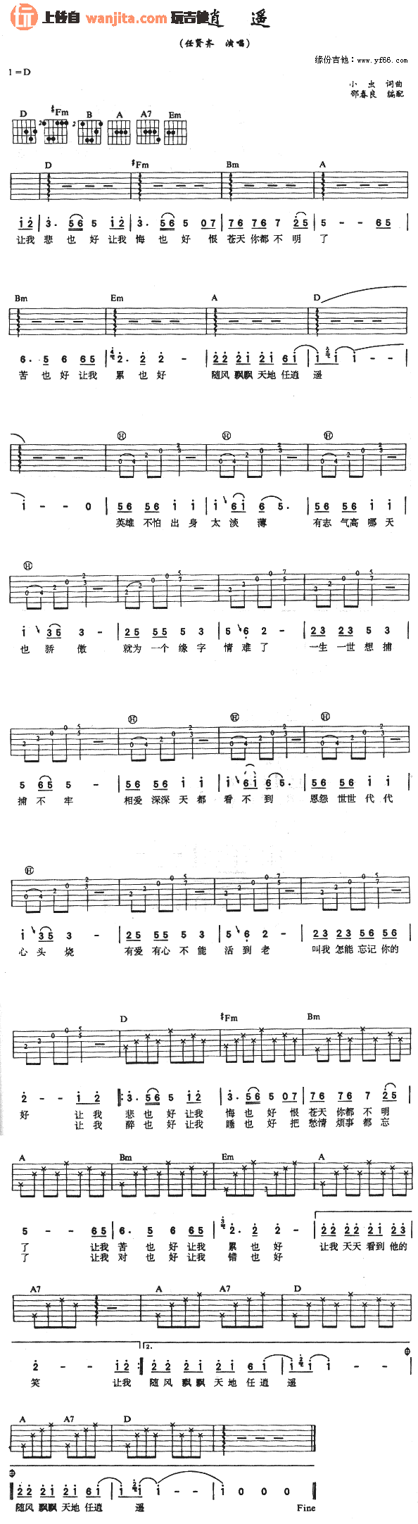 曲谱介绍: 由邵春良老师编配的任贤齐《任逍遥》吉他谱,总共1张高清图片谱,选用D调指法,节拍4/4拍,不使用变调夹,弹唱难度初级。