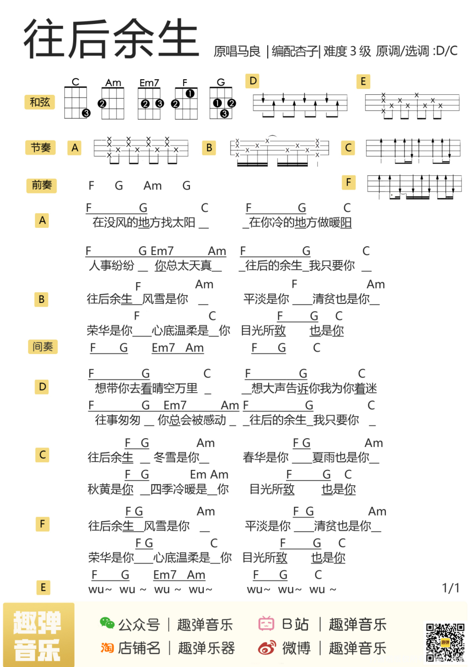 曲谱介绍: 前两天大学的闺蜜结婚啦 这是真是一件让我高兴 又肉疼的事情 他们在大学相恋四年 吵吵闹闹也始终陪伴在对方身边 以后他们就要过上 一屋两人三餐四季的小日子啦 这不就是爱情里最好的状态嘛~ 今天杏子老师跟大家 分享的歌曲是马良的「往后余生」 愿你以后的生活 有人与你立黄昏 有人问你粥可温   弹唱视频 马良,实力出众的新生代音乐人,创作型歌手,喜欢写歌的他用歌声记录自己的生活,每一次创作都投入了大量的心血。 《往后余生》这首歌还未正式发行之前,就被抖音带火了。深情的歌词搭配温柔的旋律唱出了爱情里最好的状态——两个人互相陪伴,寒来暑往,秋收冬藏,来日方长,往后余生。 歌里有一段词:“往后余生,风雪是你,平淡是你,清贫也是你;荣华是你,心底温柔是你,目光所致也是你。” 没有轰轰烈烈的誓言,一字一句却足够坚定。难怪有人说,最美的告白情书,被写在了一首歌里。 不同于马良低沉的声线,杏子甜美而温柔的嗓音就像在耳边轻声呢喃。听完杏子的歌,你有没有想到某个人,你们现在怎么样啦?欢迎来留言区分享你们的故事哦~   歌曲教学   弹唱曲谱