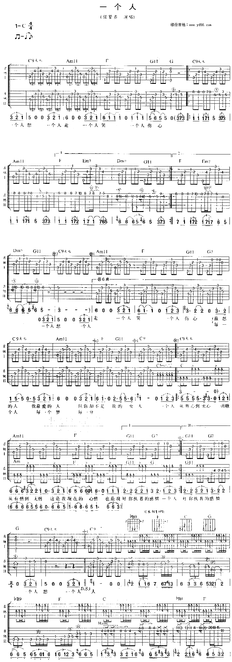 曲谱介绍: 任贤齐《一个人》吉他谱,总共1张高清图片谱,选用C调指法,节拍4/4拍,不使用变调夹,弹唱难度初级。