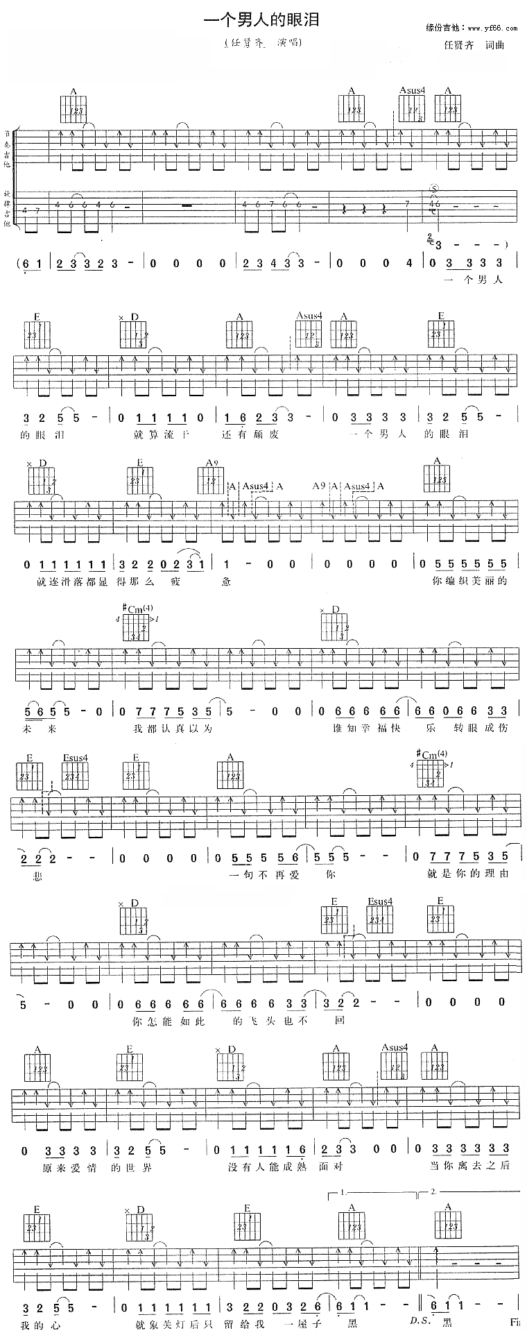 曲谱介绍: 任贤齐《一个男人的眼泪》吉他谱,总共1张高清图片谱,节拍4/4拍,不使用变调夹,弹唱难度初级。