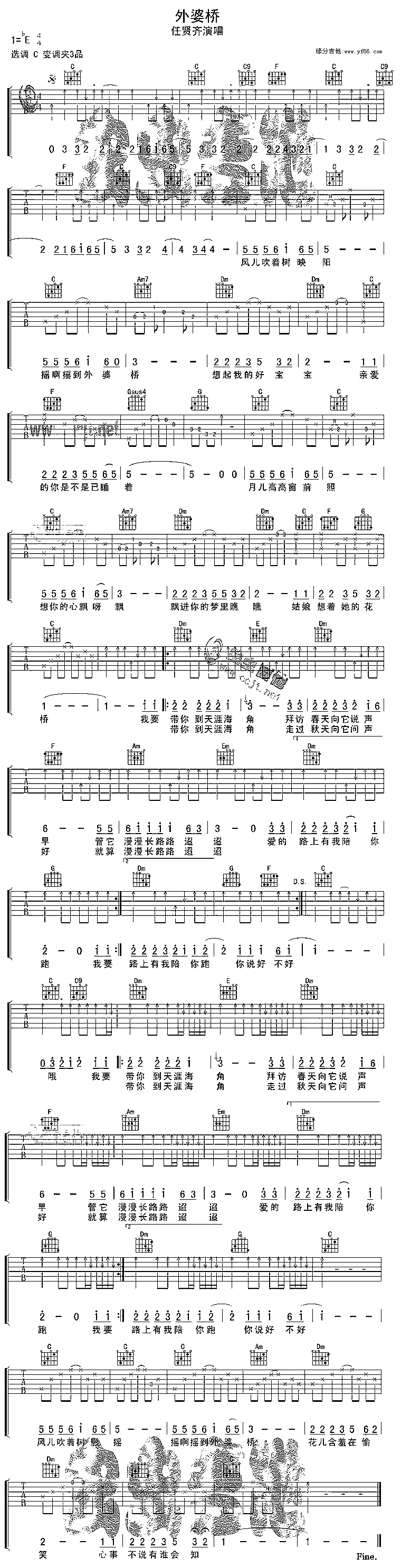 曲谱介绍: 任贤齐《外婆桥》吉他谱,总共1张高清图片谱,原调为降E调,选用C调指法,节拍4/4拍,建议使用变调夹夹三品,弹唱难度初级。