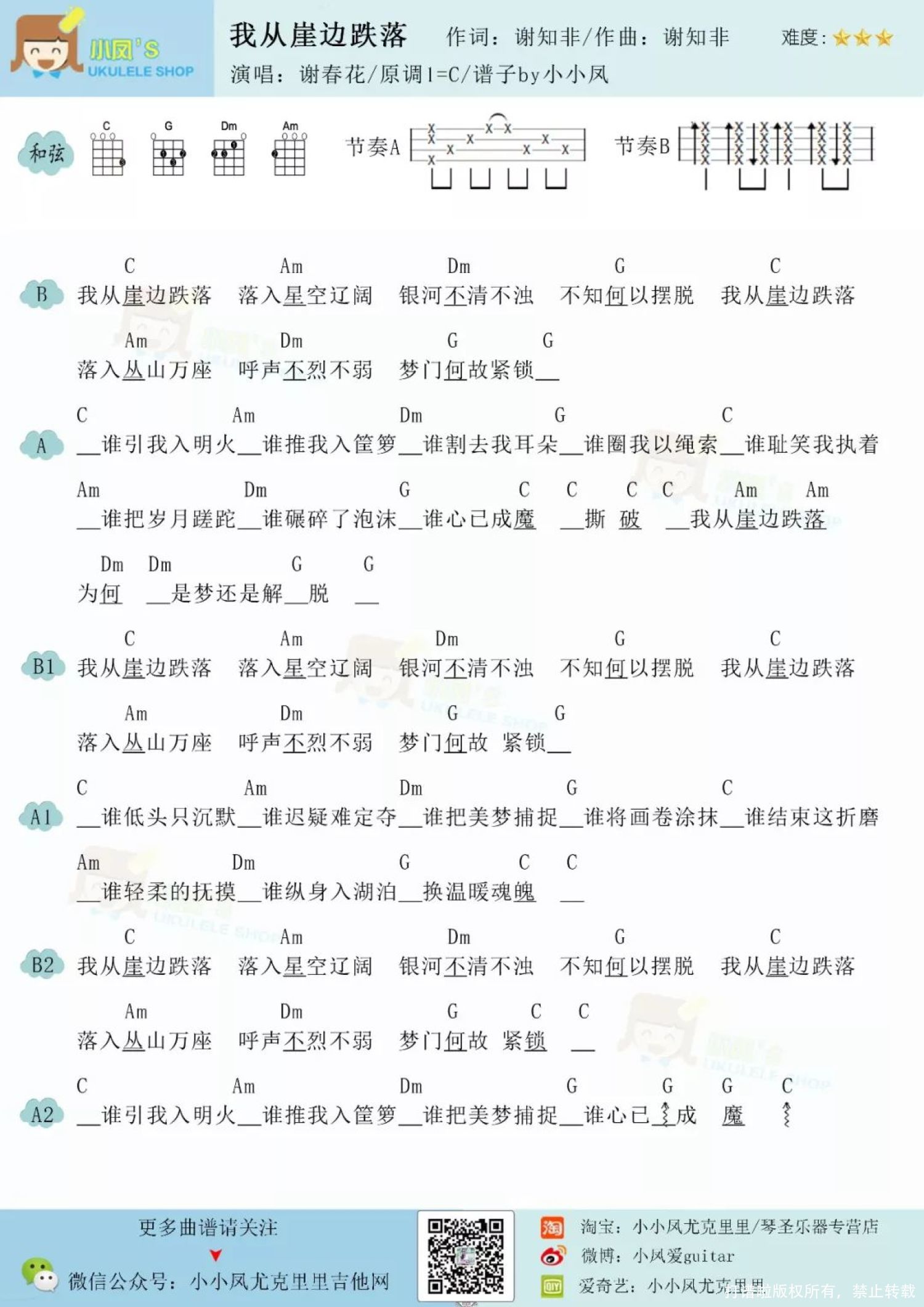曲谱介绍: 《我从崖边跌落》尤克里里弹唱谱 音乐有着众多的类型 除了大众爱听的流行音乐以外 还有很多非常好听的音乐 值得我们去挖掘 音乐就像银河中的星星多的数不尽 有的被人发现,有的没有被人发现 今天给大家带来的是一首 非常好听,歌词非常美的民谣