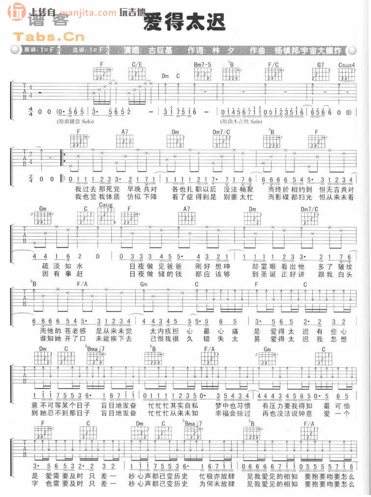 曲谱介绍: 古巨基《爱得太迟》吉他谱,总共1张高清图片谱,原调为F调,选用F调指法,节拍4/4拍,不使用变调夹,弹唱难度初级。