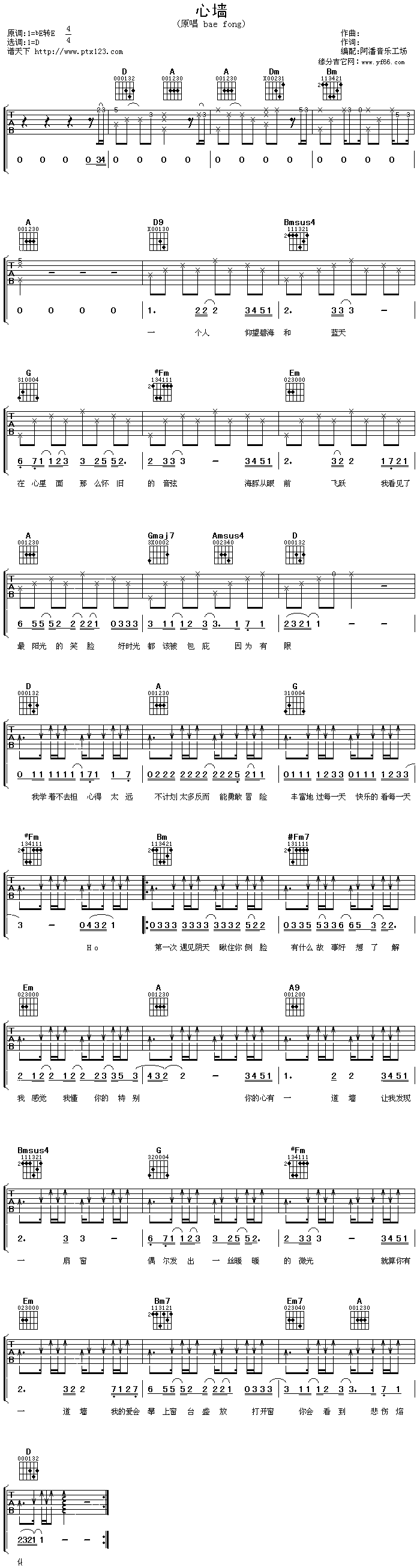 曲谱介绍: 郭静《心墙》吉他谱,总共1张高清图片谱,原调为降E转E调,选用D调指法,节拍4/4拍,不使用变调夹,弹唱难度初级。