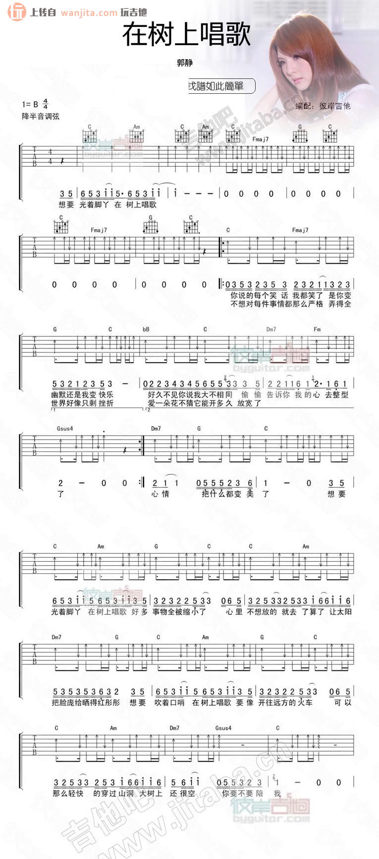 曲谱介绍: 郭静《在树上唱歌》吉他谱,总共1张高清图片谱,选用B调指法,降半音调弦,节拍4/4拍,不使用变调夹,弹唱难度初级。