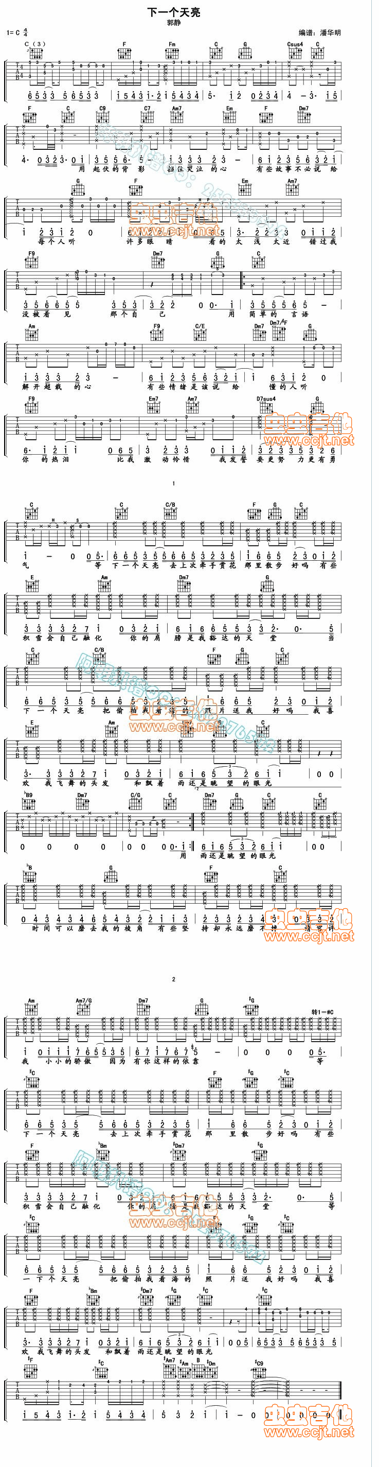 曲谱介绍: 由潘华明编配制谱的《下一个天亮》吉他谱,总共1张高清图片谱,选用C调指法,节拍4/4拍,不使用变调夹,弹唱难度初级。