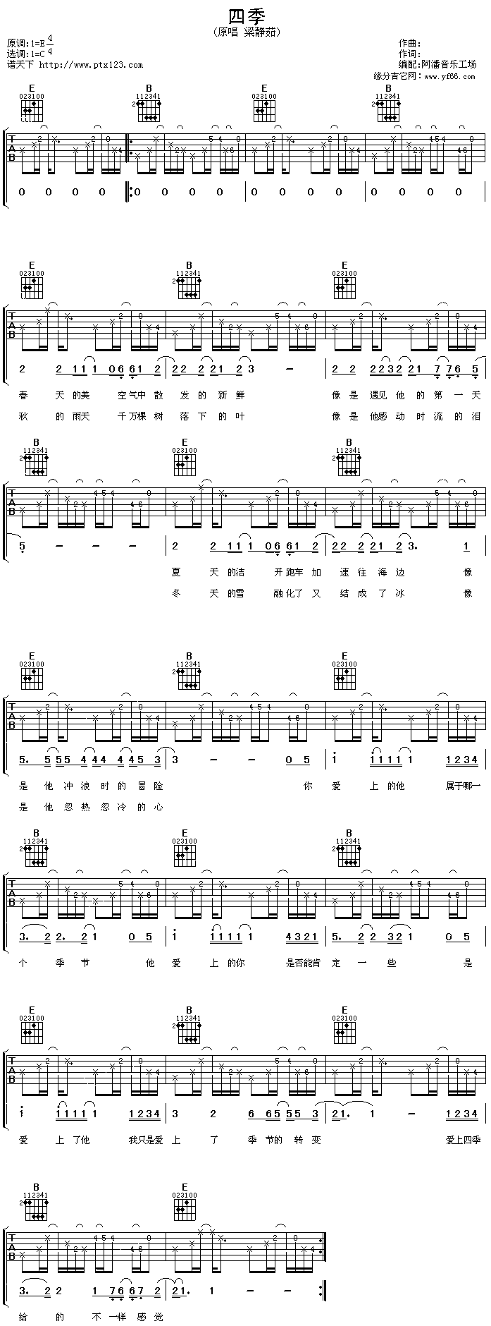 曲谱介绍: 由阿潘音乐工场制谱的《四季》吉他谱,总共1张高清图片谱,原调为E调,选用C调,节拍4/4拍,不使用变调夹,弹唱难度初级。