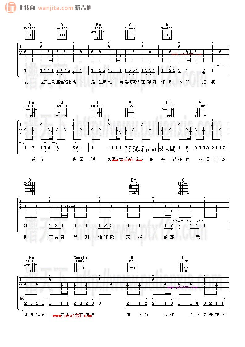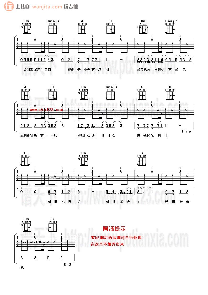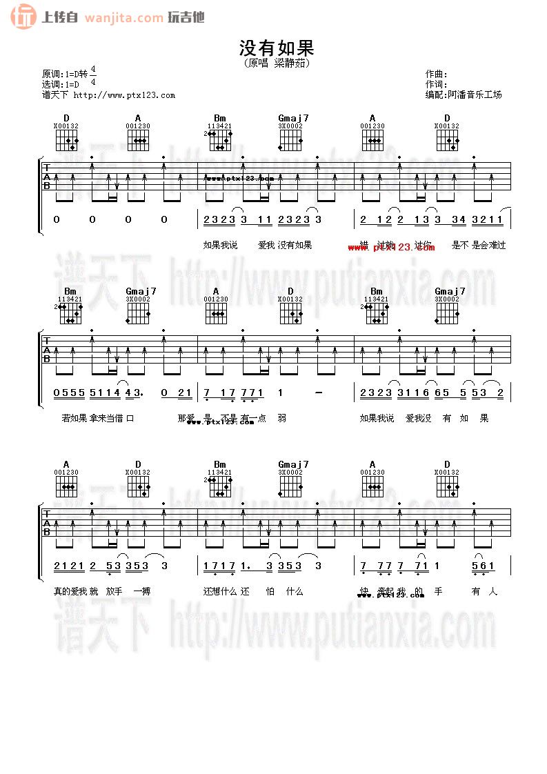 曲谱介绍: 梁静茹《没有如果》吉他谱,总共3张高清图片谱,原调为D调,选用D调,节拍4/4拍,不使用变调夹,弹唱难度初级。