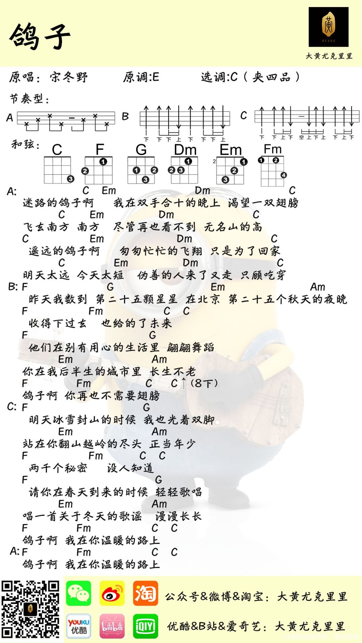 曲谱介绍: 你应该也有这种经验 在某一段时间里 总是重复听着同一首歌 忘记听了几遍 听到觉得自己像消失了 钻进那首歌里去了 那一阵子,我的主题曲就是宋冬野的《鸽子》   尤克里里演示   弹唱教学   尤克里里谱