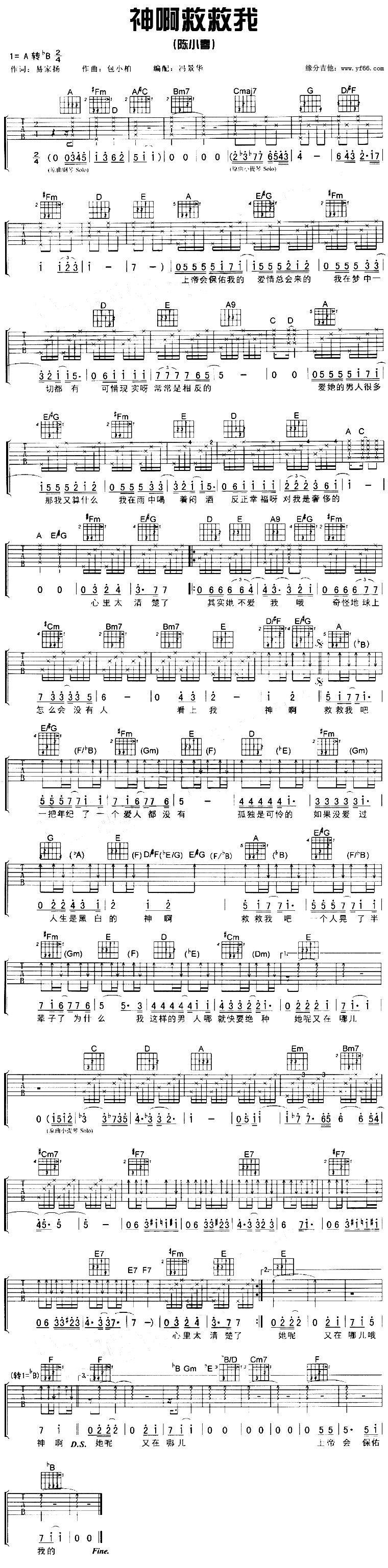 曲谱介绍: 《神啊救救我》吉他谱,总共1张高清图片谱,选用A调转降B调,节拍2/4拍,不使用变调夹,弹唱难度初级。