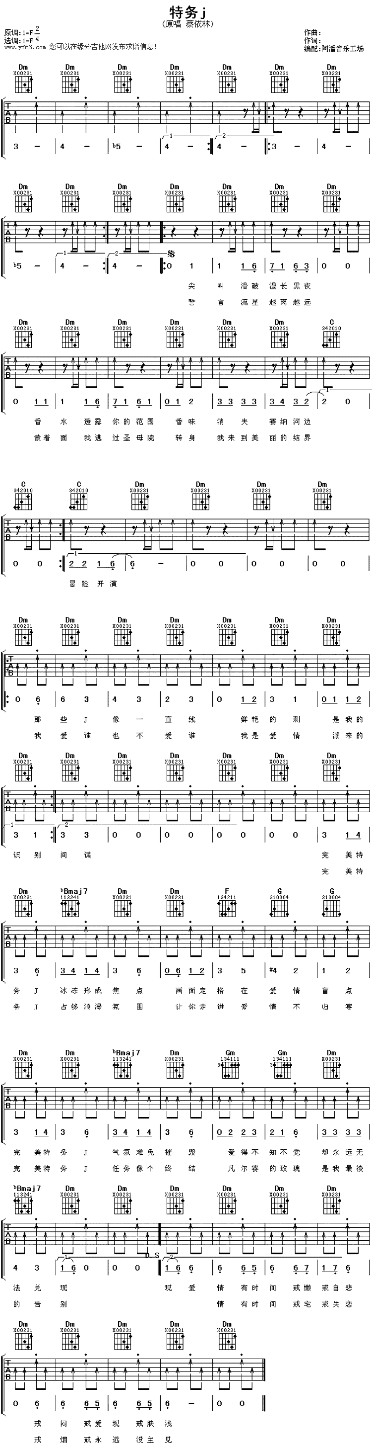 曲谱介绍: 蔡依林《特务J》吉他谱,总共1张高清图片谱,原调F调,选用F调,节拍2/4拍,不使用变调夹,弹唱难度初级。
