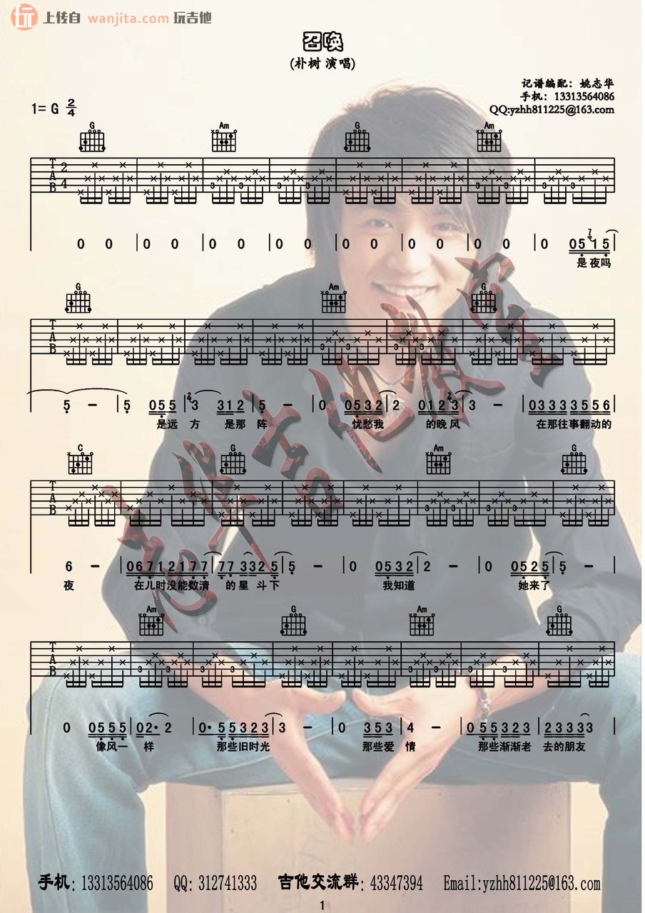 曲谱介绍: 朴树《召唤》吉他谱,总共3张高清图片谱,选用G调,节拍2/4拍,不使用变调夹,弹唱难度初级。