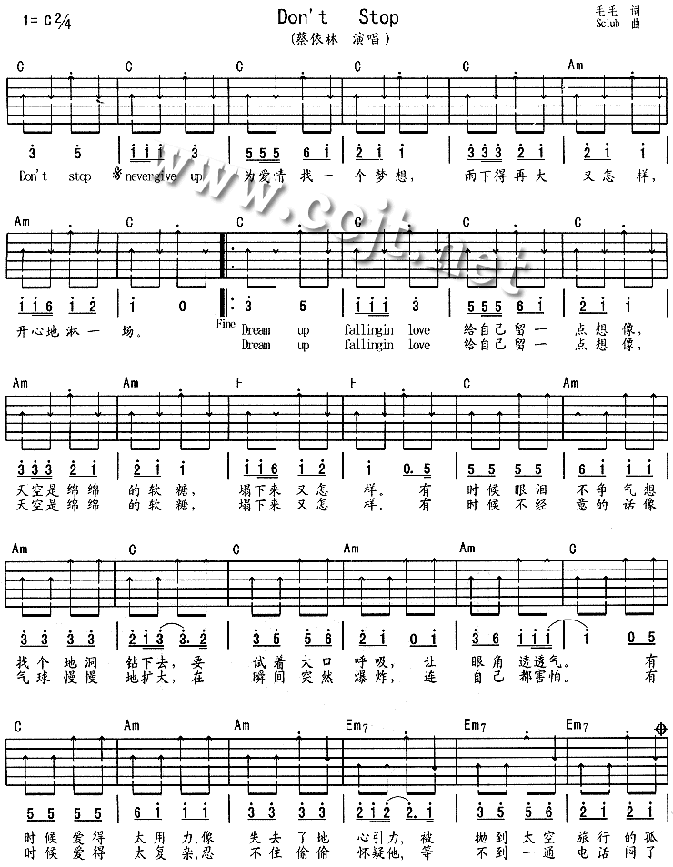 曲谱介绍: 蔡依林《Don’t Stop》吉他谱,总共2张高清图片谱,选用C调,节拍2/4拍,不使用变调夹,弹唱难度初级。