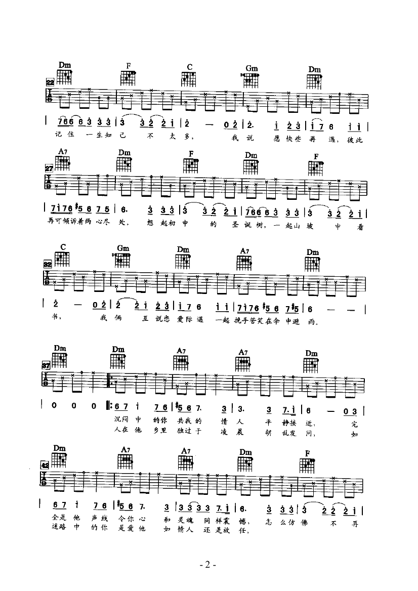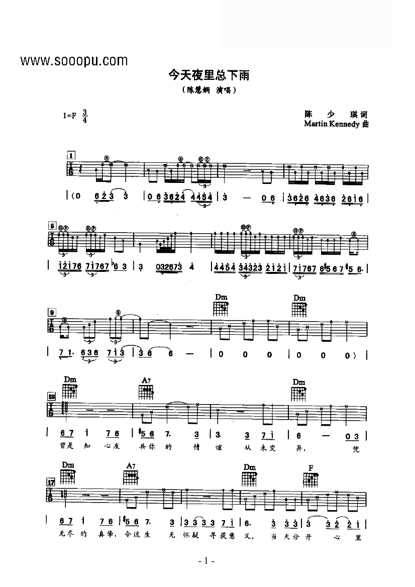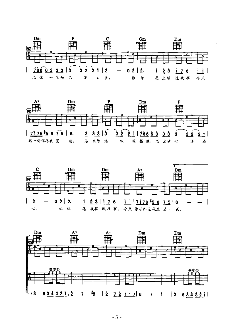 曲谱介绍: 《今天夜里总下雨》吉他谱,总共3张高清图片谱,选用F调,节拍3/4拍,不使用变调夹,弹唱难度初级。