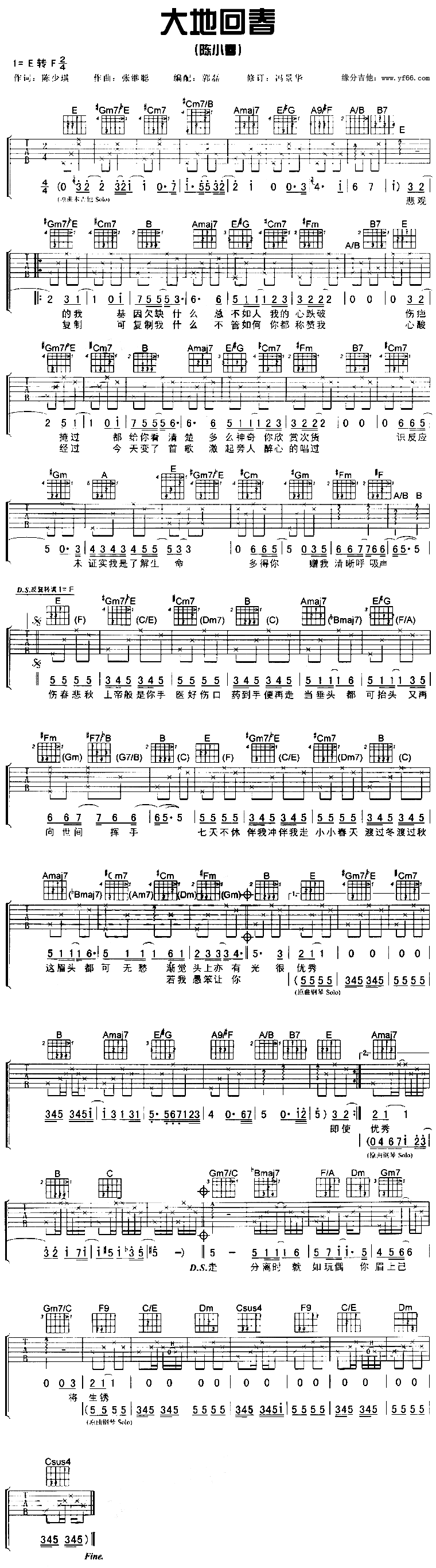 曲谱介绍: 《大地回春》吉他谱,总共1张高清图片谱,选用E调转F调,节拍2/4拍,不使用变调夹,弹唱难度初级。