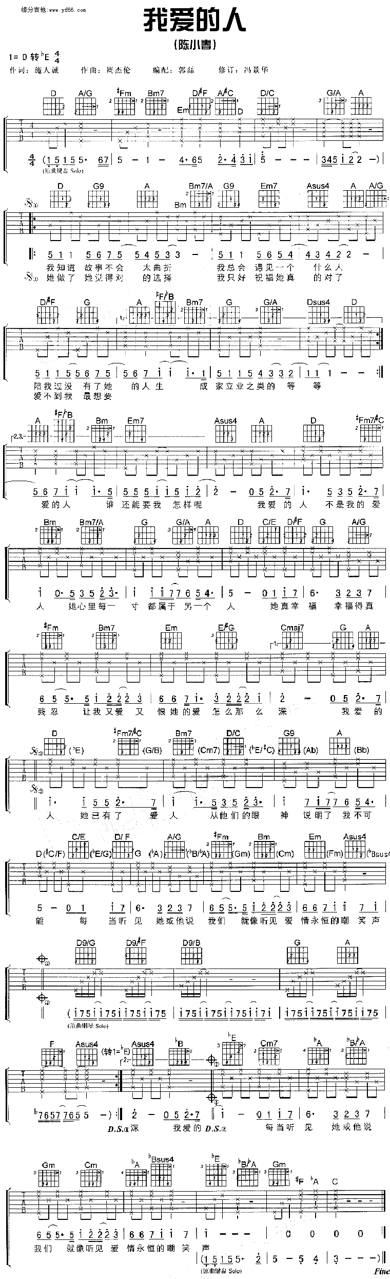 曲谱介绍: 陈小春《我爱的人》吉他谱,总共1张高清图片谱,选用D调转降E调,节拍4/4拍,不使用变调夹,弹唱难度初级。