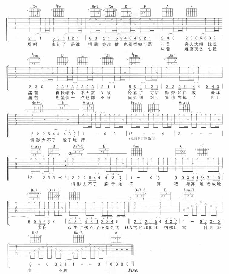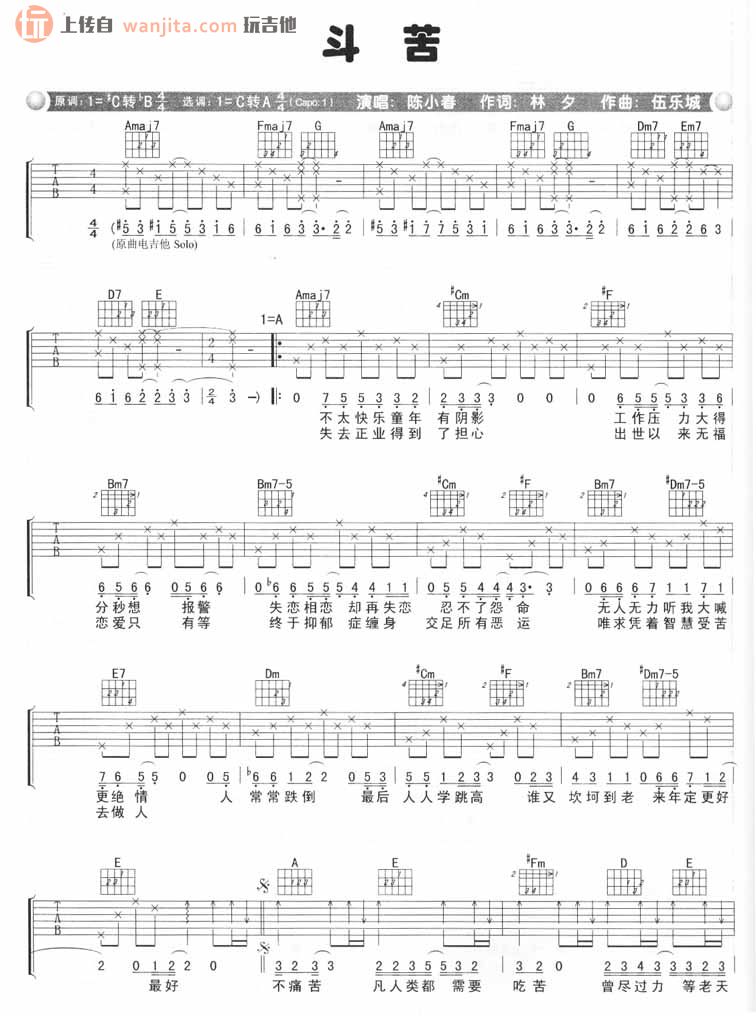 曲谱介绍: 陈小春《斗苦》吉他谱,总共2张高清图片谱,原调bC调转bB调,选用C调转A调,节拍4/4拍,建议使用变调夹夹一品,弹唱难度初级。
