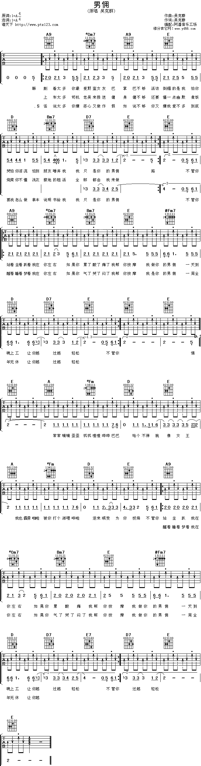 曲谱介绍: 吴克群《男佣》吉他谱,总共1张高清图片谱,原调A调,选用A调,节拍4/4拍,不使用变调夹,弹唱难度初级。