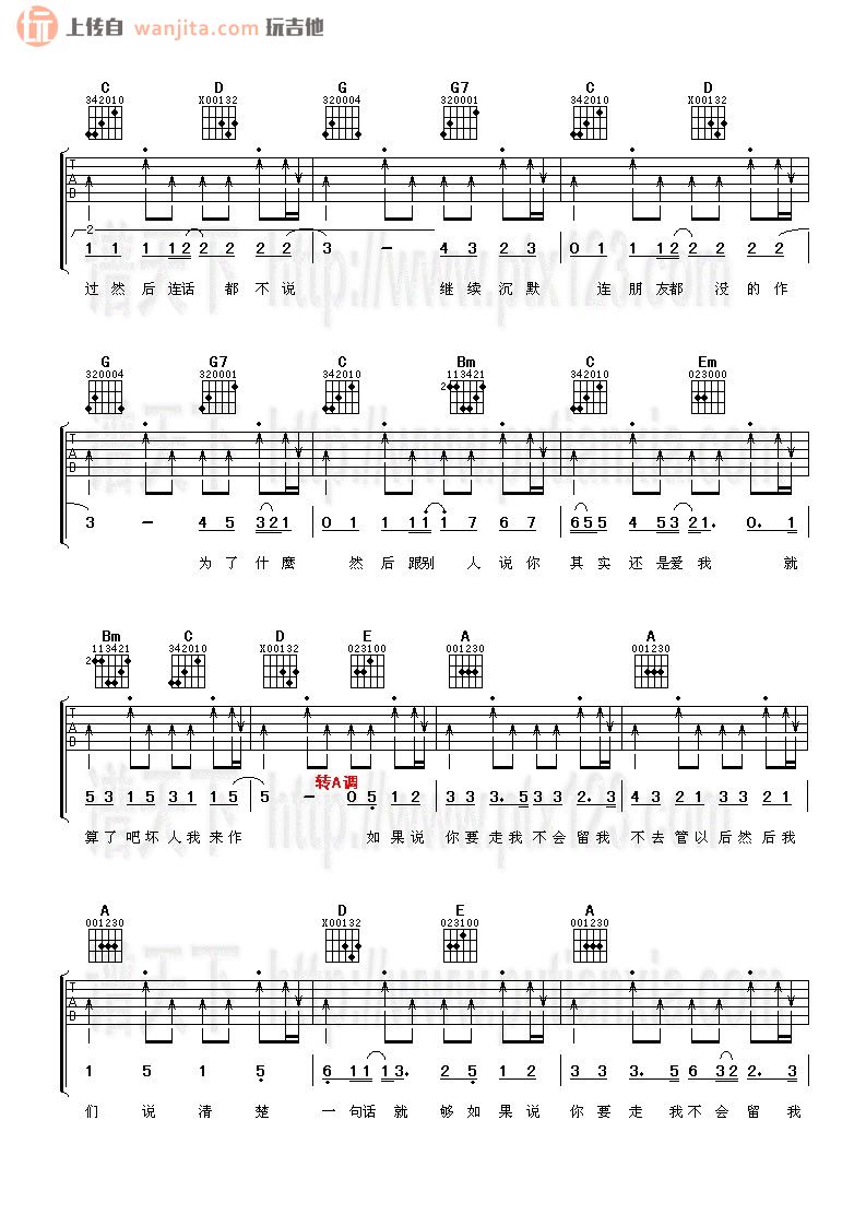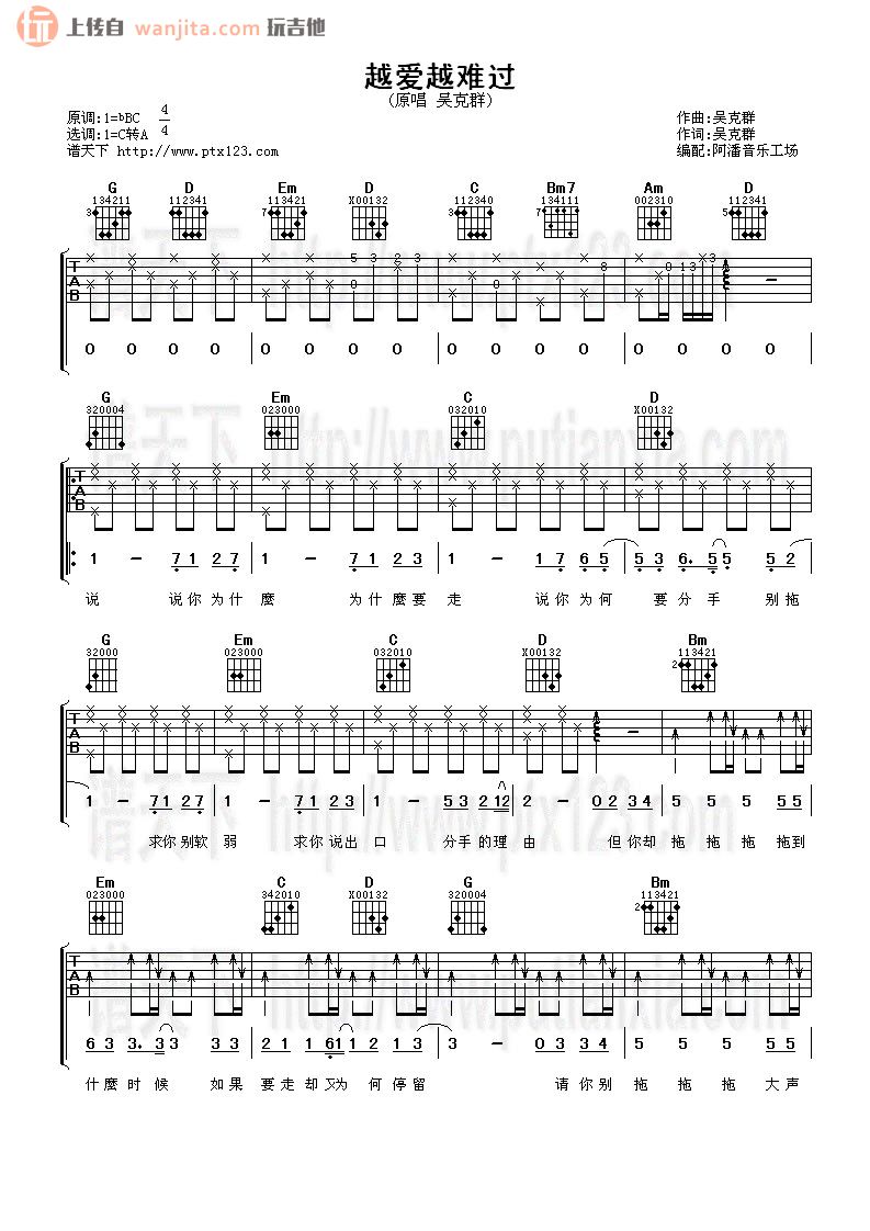 曲谱介绍: 吴克群《越爱越难过》吉他谱,总共3张高清图片谱,原调bBC调,选用C调转A调,节拍4/4拍,不使用变调夹,弹唱难度初级。