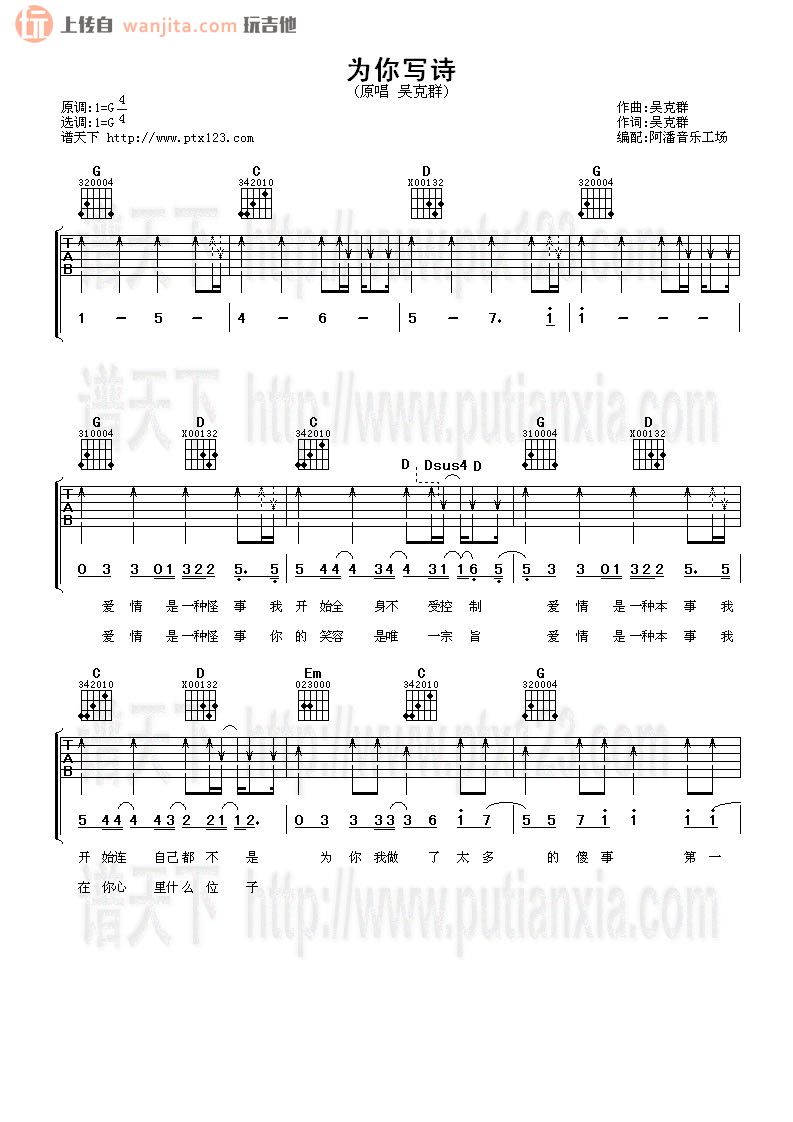 为你写诗吉他谱 - 吴克群 - G调吉他弹唱谱 - 原版